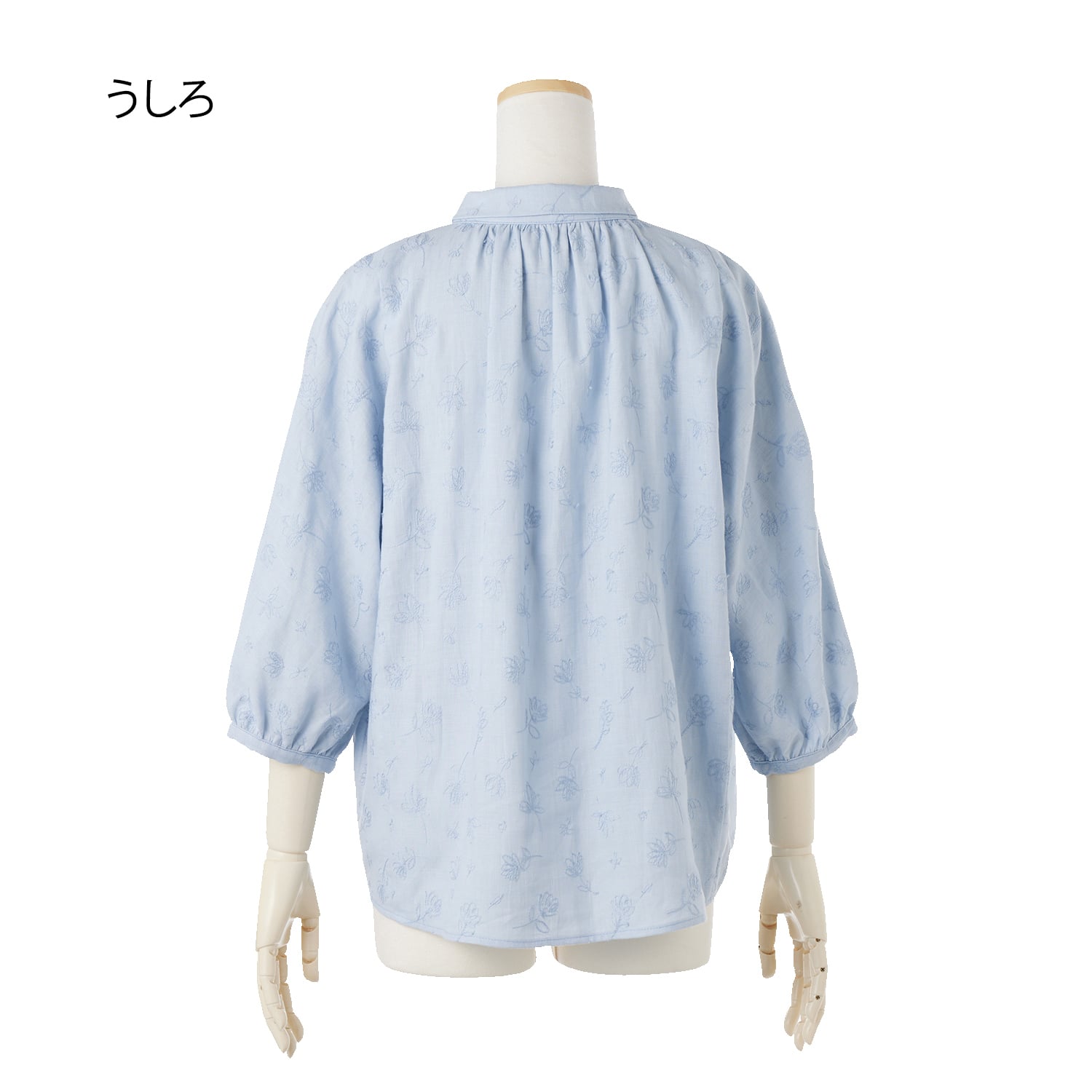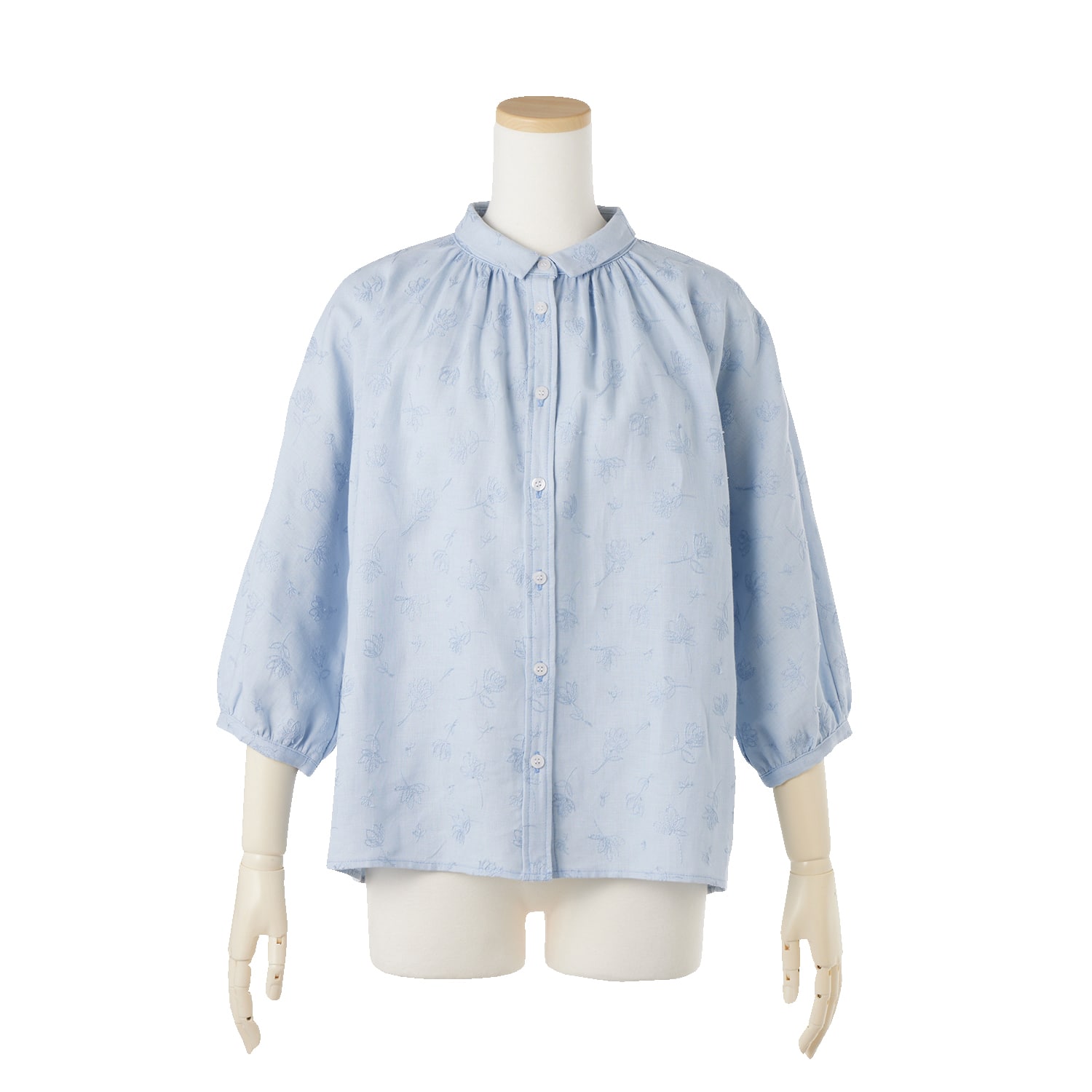 同色の糸で描いた花柄の刺繍がさりげなく、小ぶりの衿と衿回りのギャザーも女性らしい雰囲気。