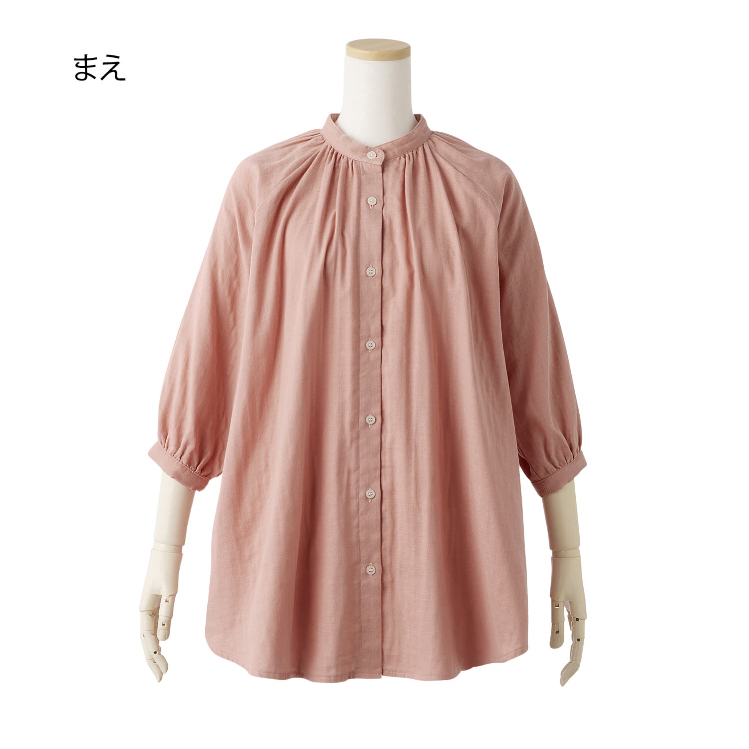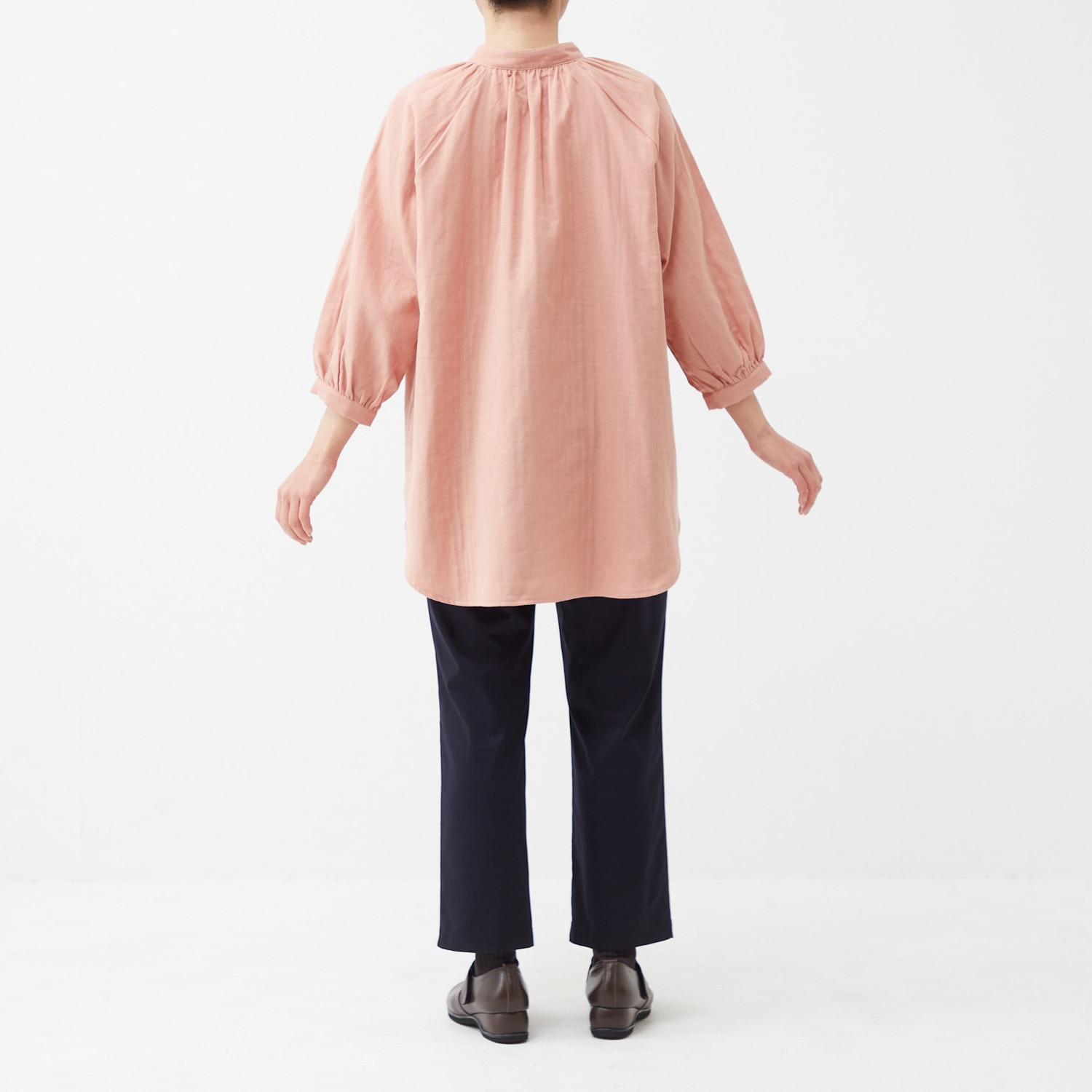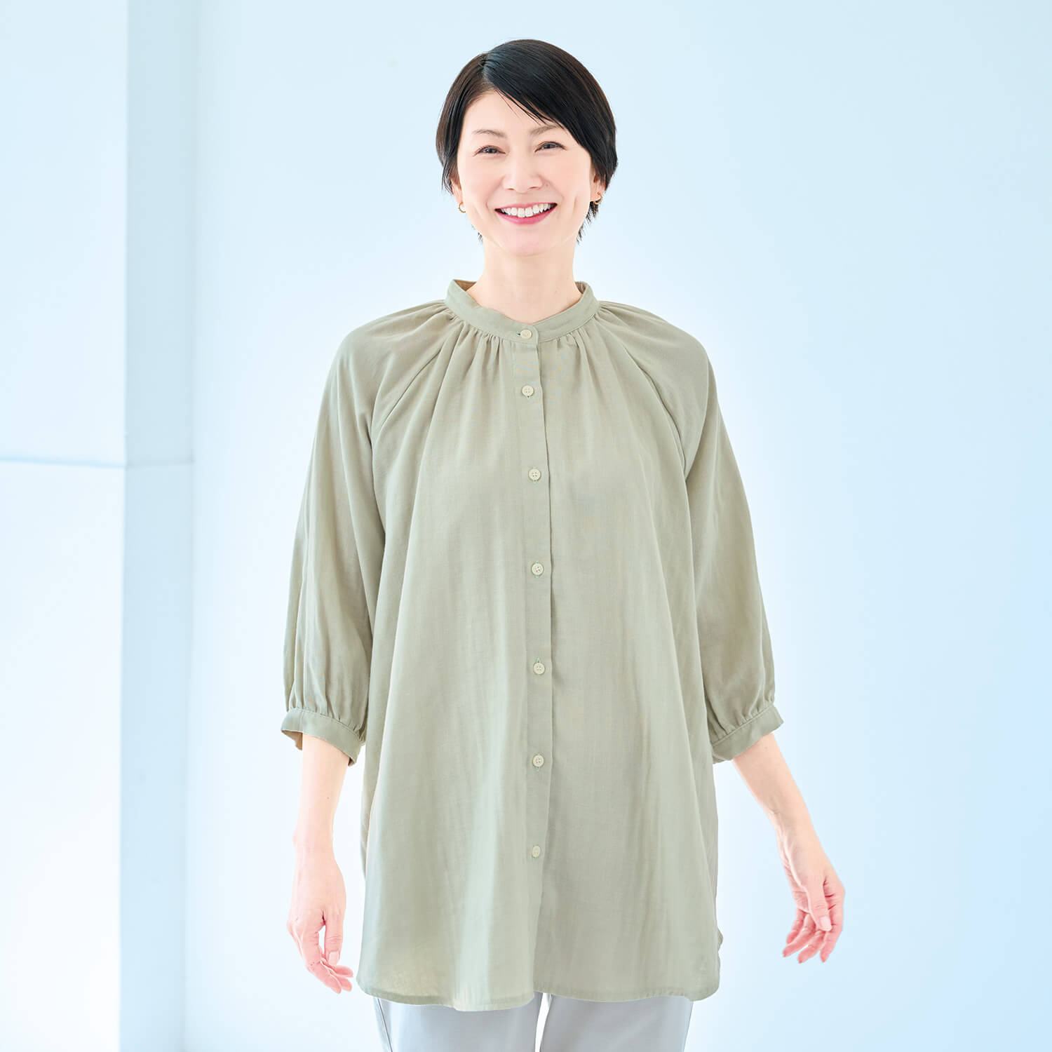 柔らかな肌触りとふんわりシルエットを叶えるダブルガーゼの生地を使用。軽やかな着心地で、洗うたびに柔らかくなります。衿回りが華やぐギャザーをあしらいつつ、お腹回りが隠れる長め丈ですっきり着こなせます。七分袖なので見た目にも軽やか。ラグランスリーブで肩回りも楽ちんです。