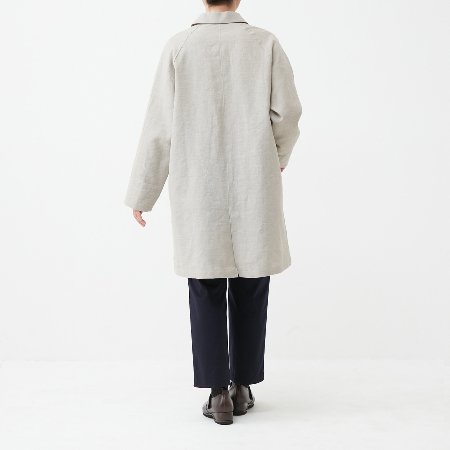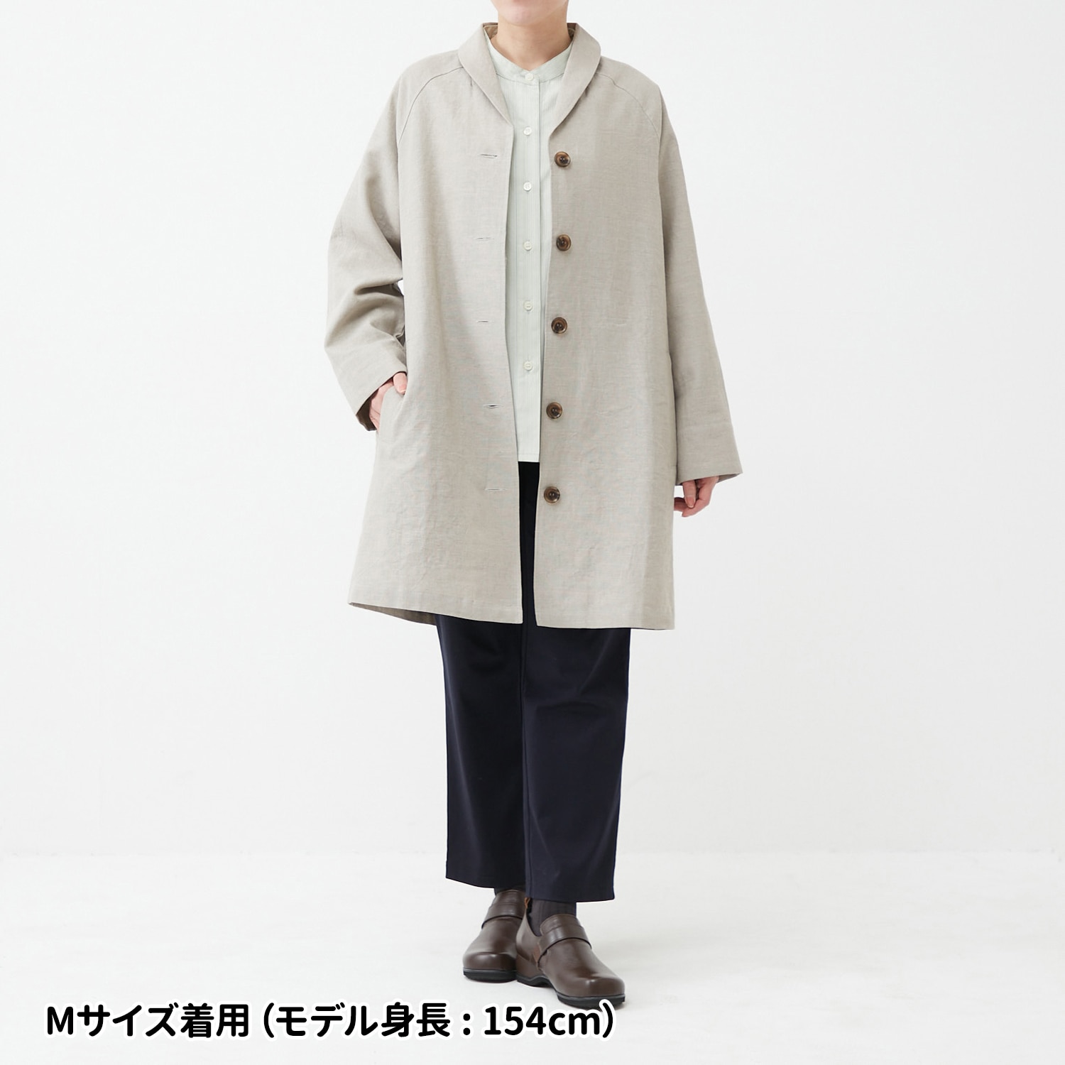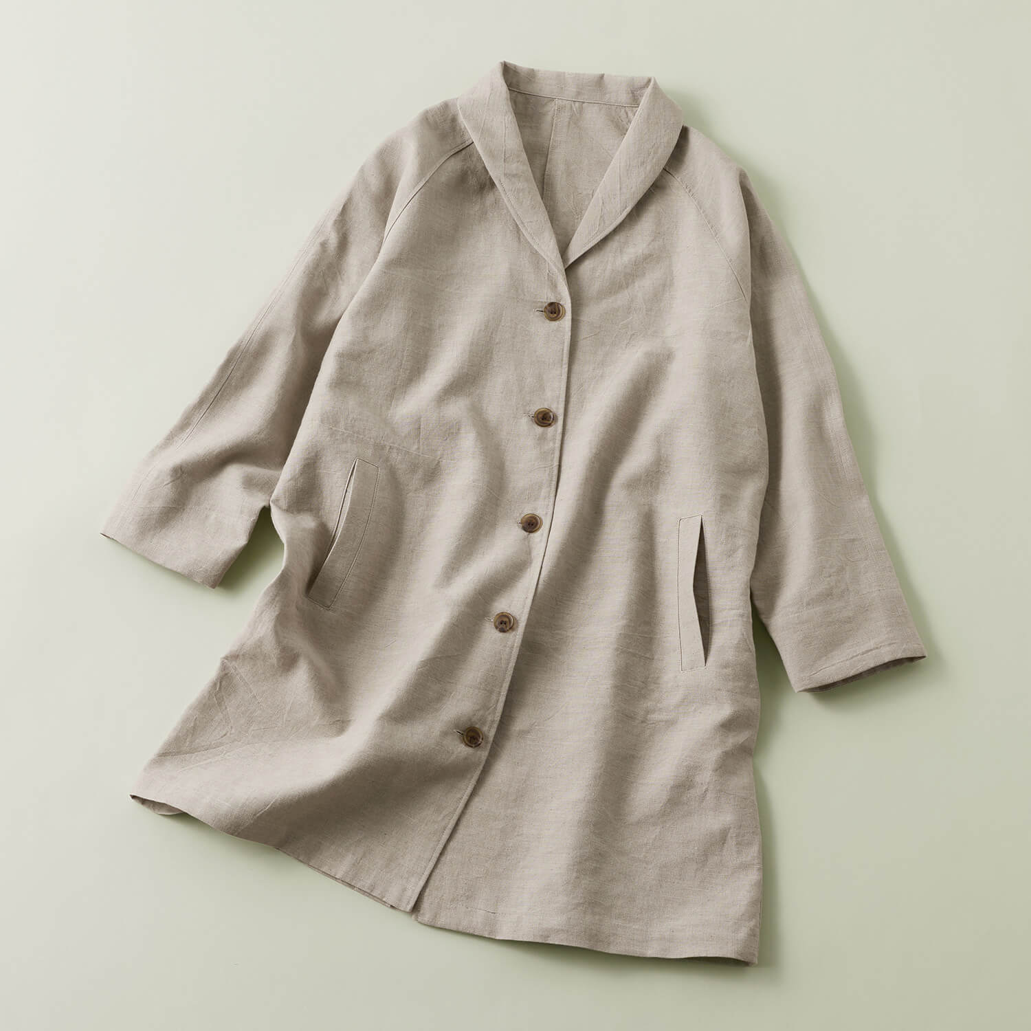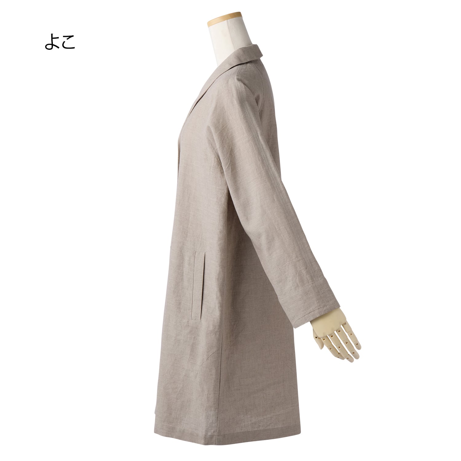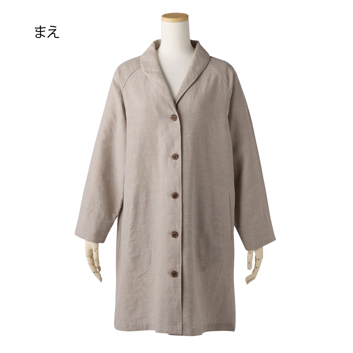 麻由来の繊維であるリネンとラミーを混紡し、さらに綿のムラ糸も使用して織り上げたこだわりの生地。染めや加工技術により、柔らかな毛羽感と豊かな表情に仕上げました。ヒップまで隠れる丈感が縦のラインを強調してすっきりスタイル良く見えます。ショールカラーが女性らしく、ほどよいきちんと感も演出。サッと羽織れ、まだ肌寒い時季から重宝します。