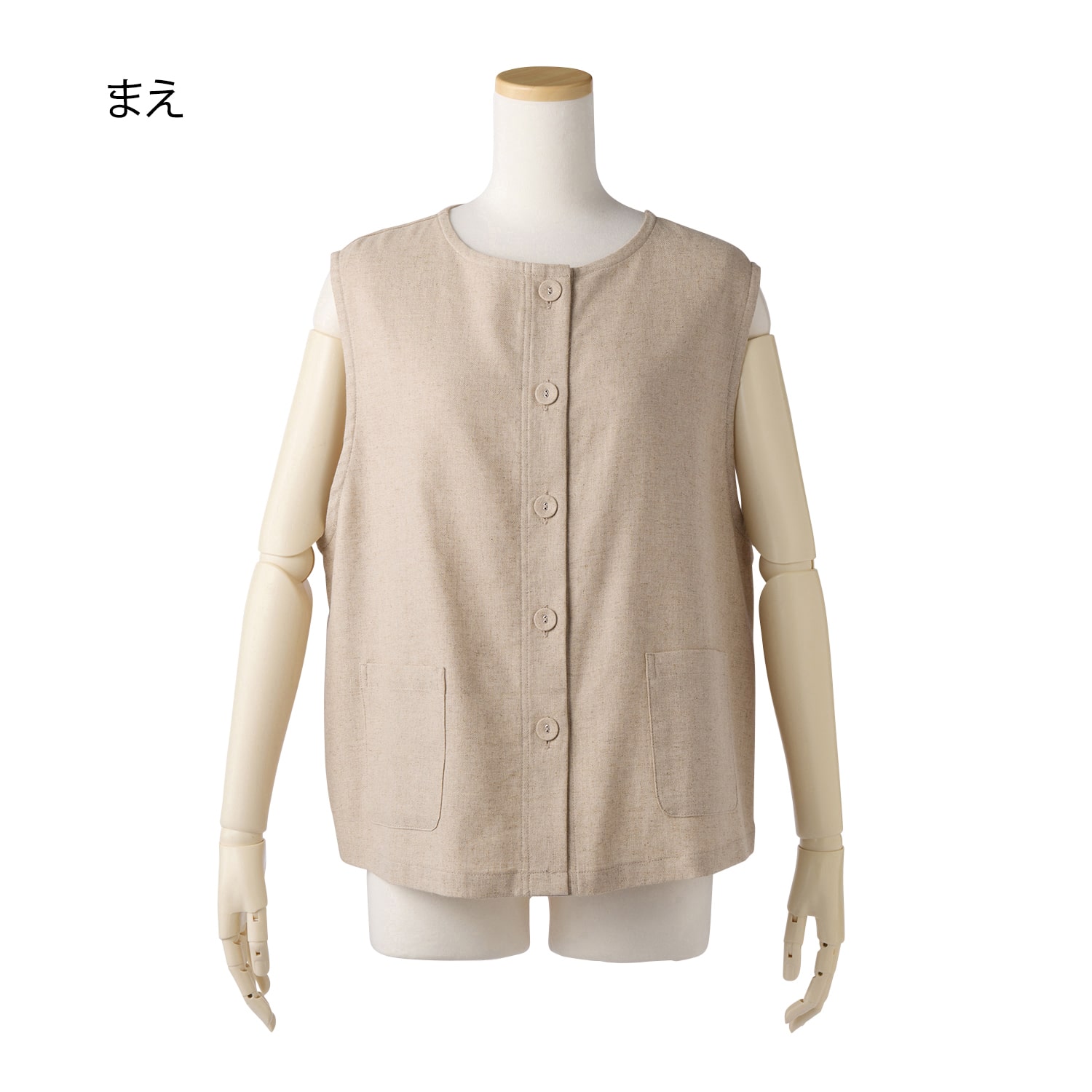 優しいコットンと爽やかなリネンを混紡した先染め生地を使用。しっかり織られた布帛地で、きちんと感がアップします。広めの肩幅とクルーネックで品良く見え、前ボタンを留めても開けて着てもおしゃれ。アームホールもゆったり設計で重ね着の際にもたつきません。