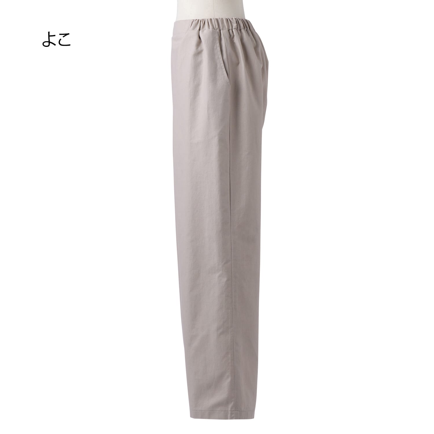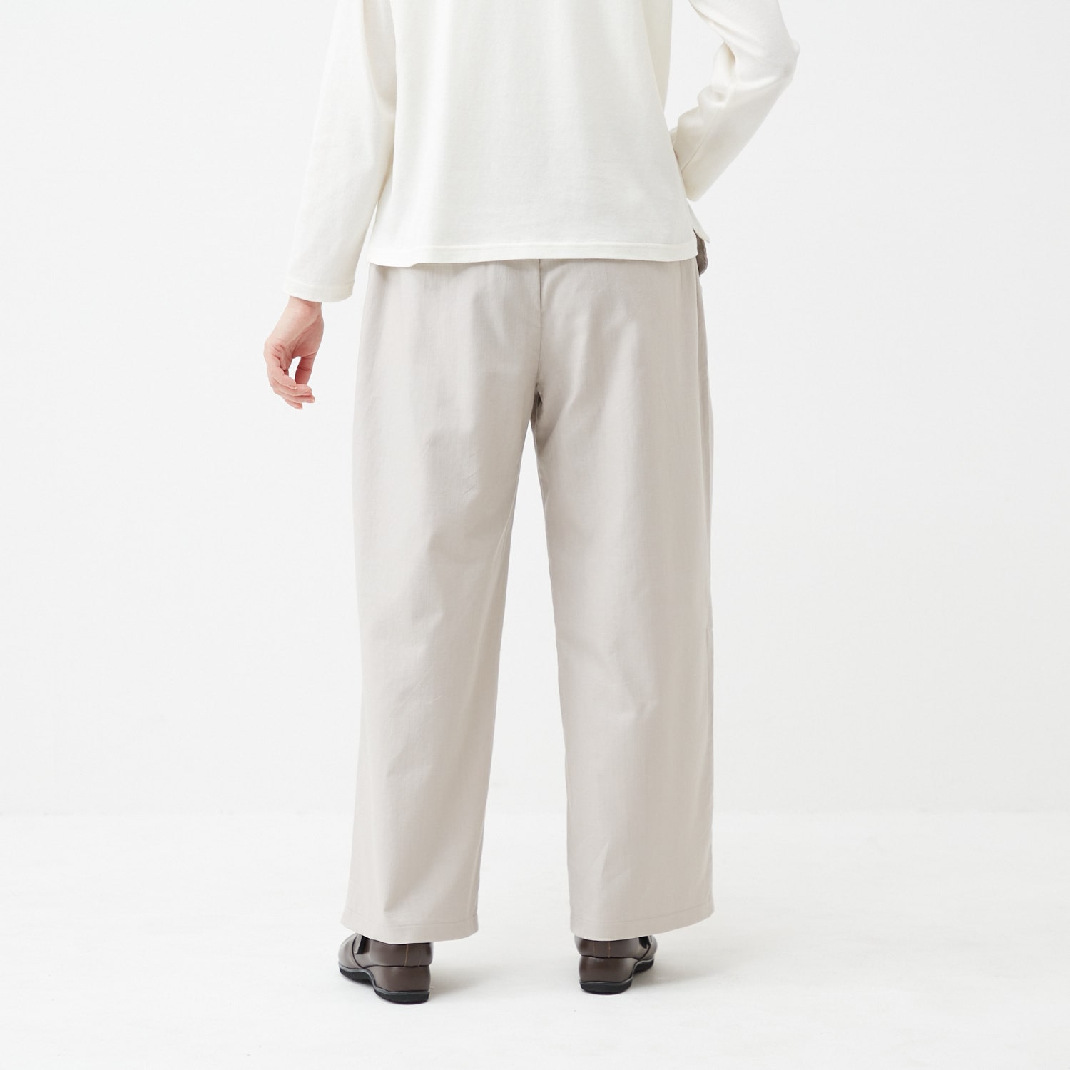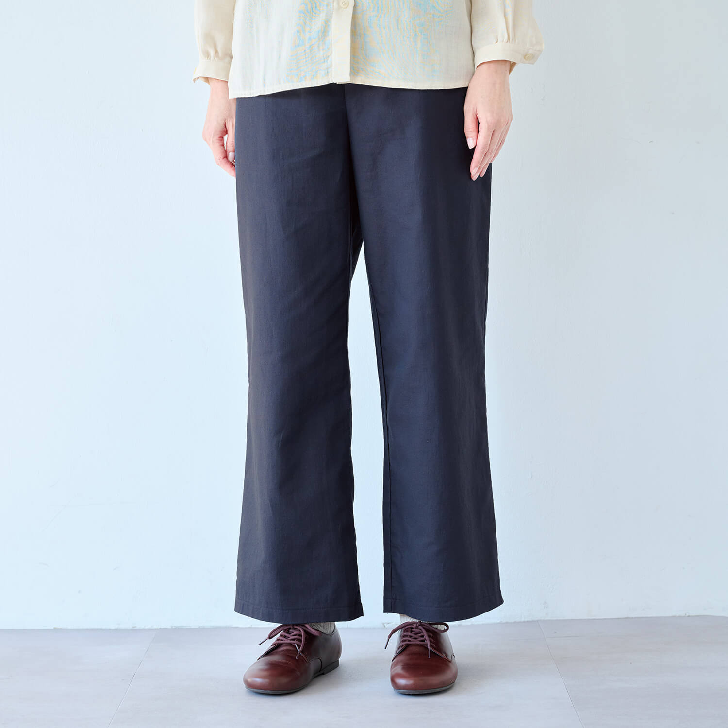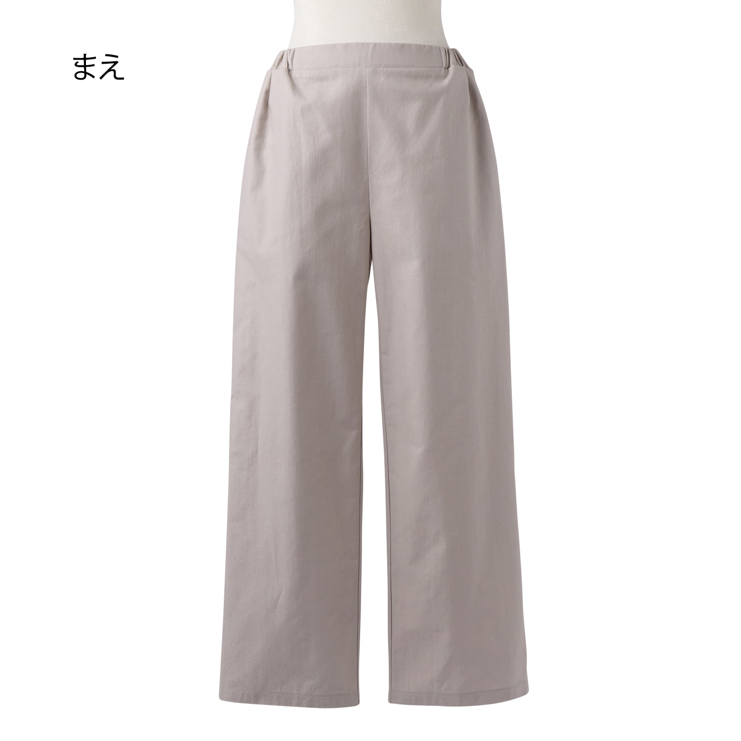 しっかりとした生地感の綿麻素材のパンツ。綿の柔らかさと麻ならではの爽やかな風合いが春にぴったりです。ほどよくゆとりのあるセミワイドシルエットで快適なはき心地。ウエストの前はすっきり、後ろはゴム仕様とタックで美脚見えが叶います。