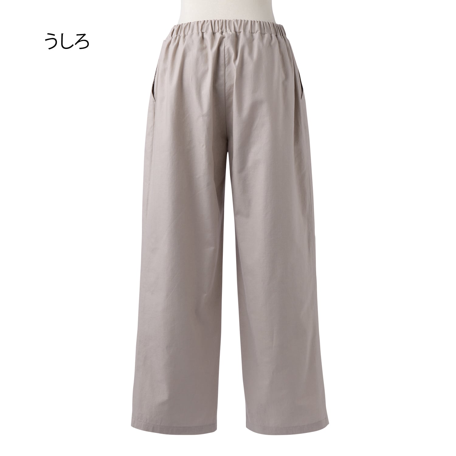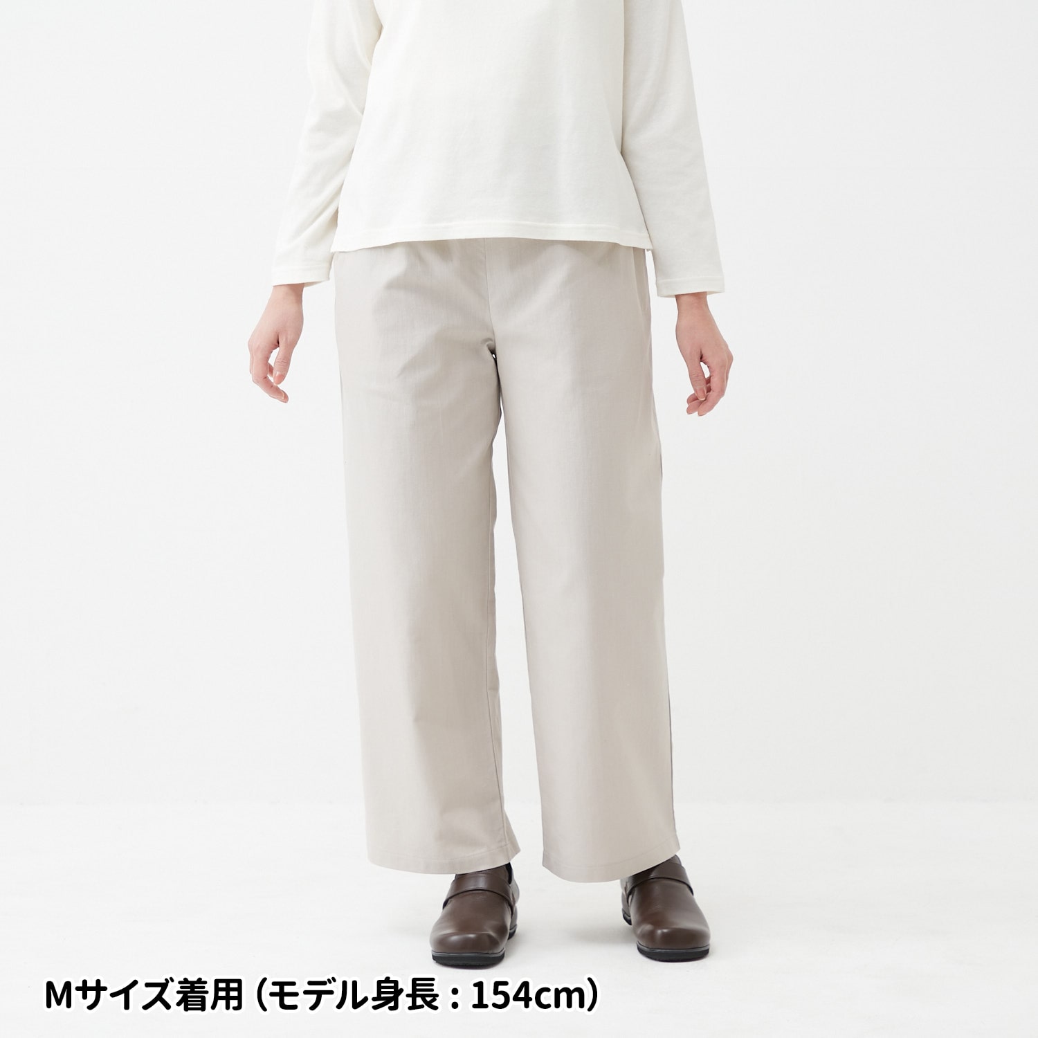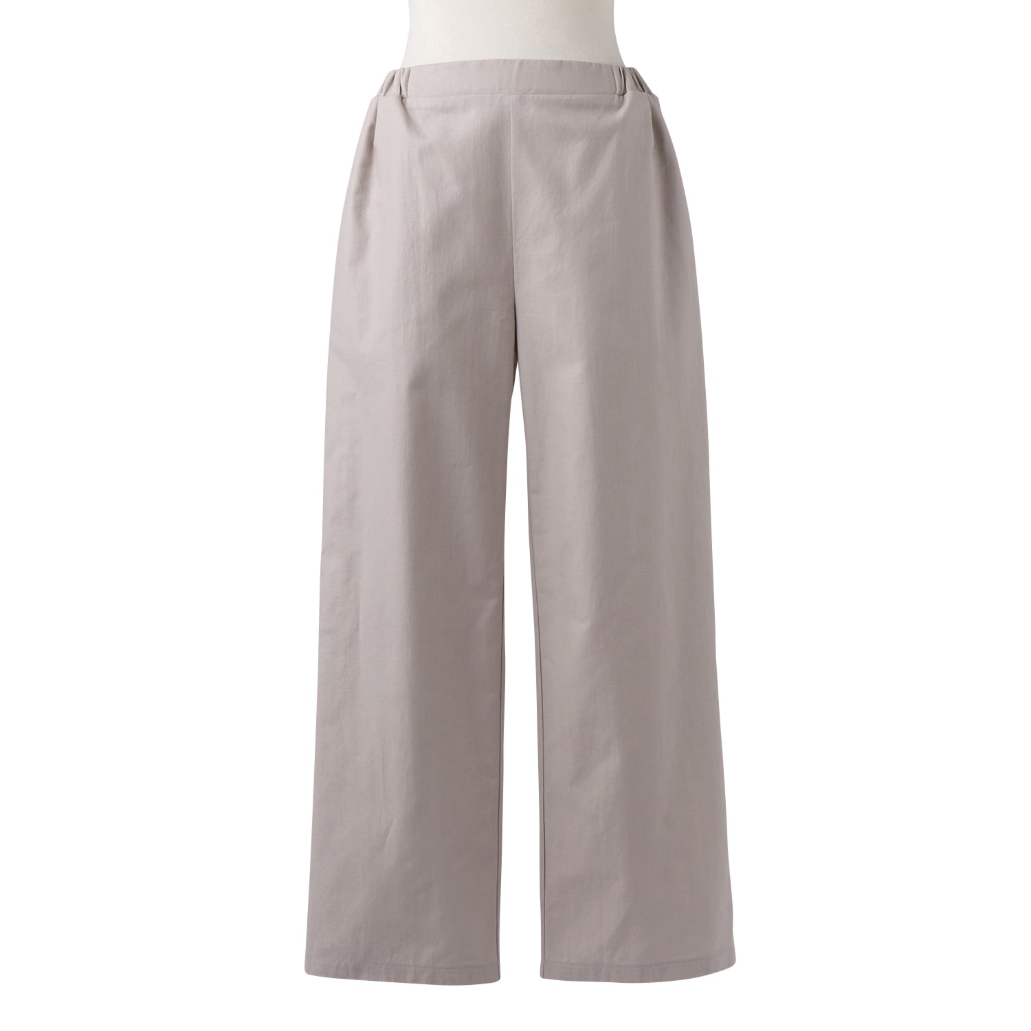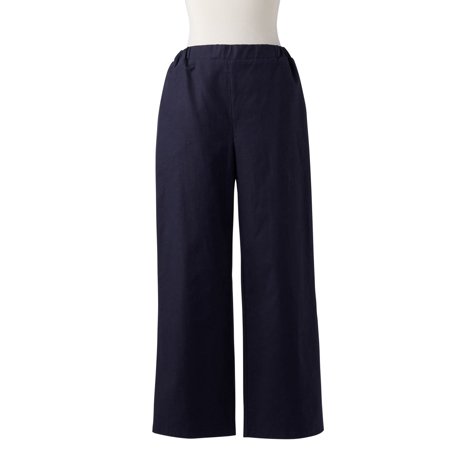 しっかりとした生地感の綿麻素材のパンツ。綿の柔らかさと麻ならではの爽やかな風合いが春にぴったりです。ほどよくゆとりのあるセミワイドシルエットで快適なはき心地。ウエストの前はすっきり、後ろはゴム仕様とタックで美脚見えが叶います。