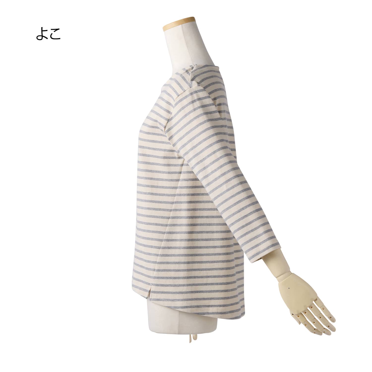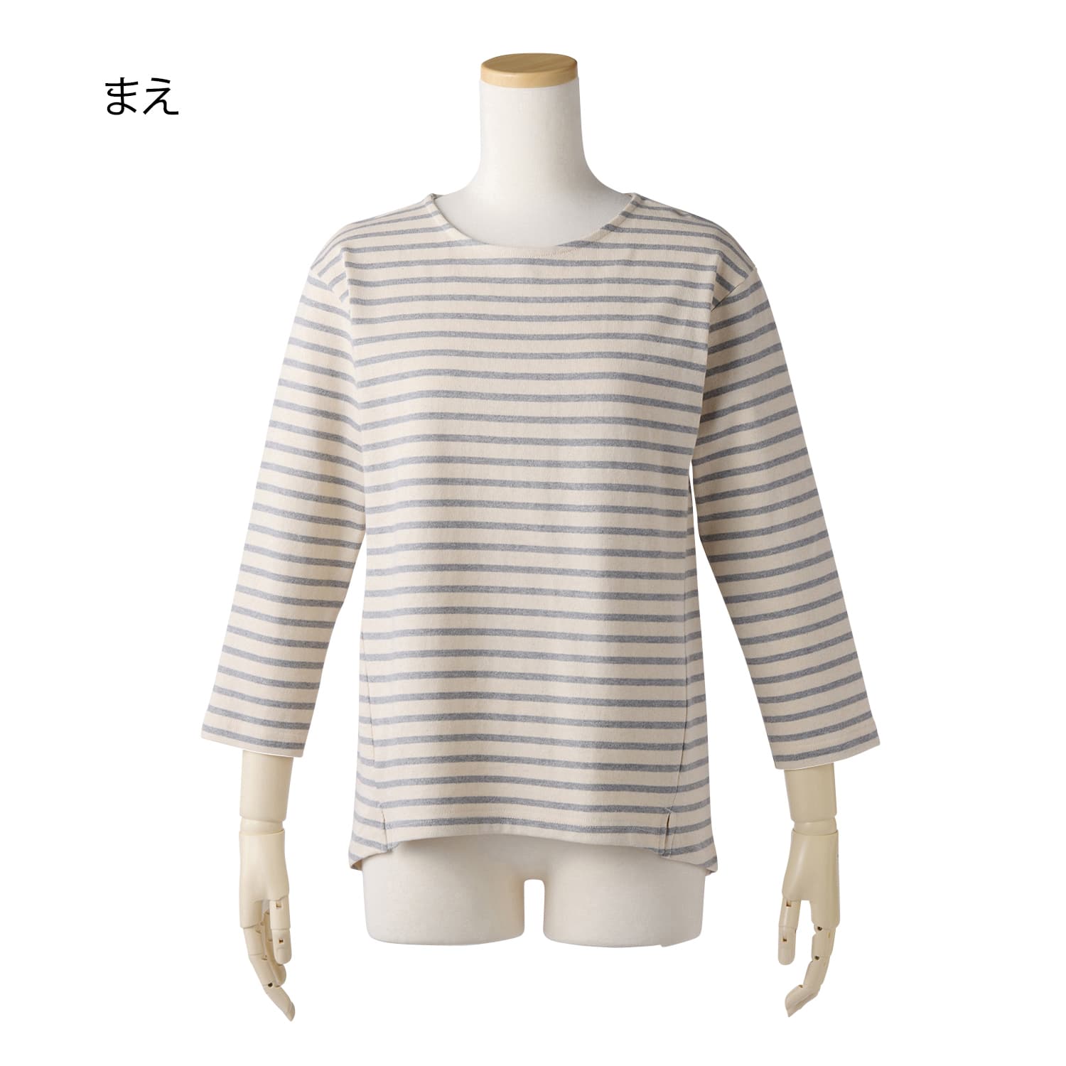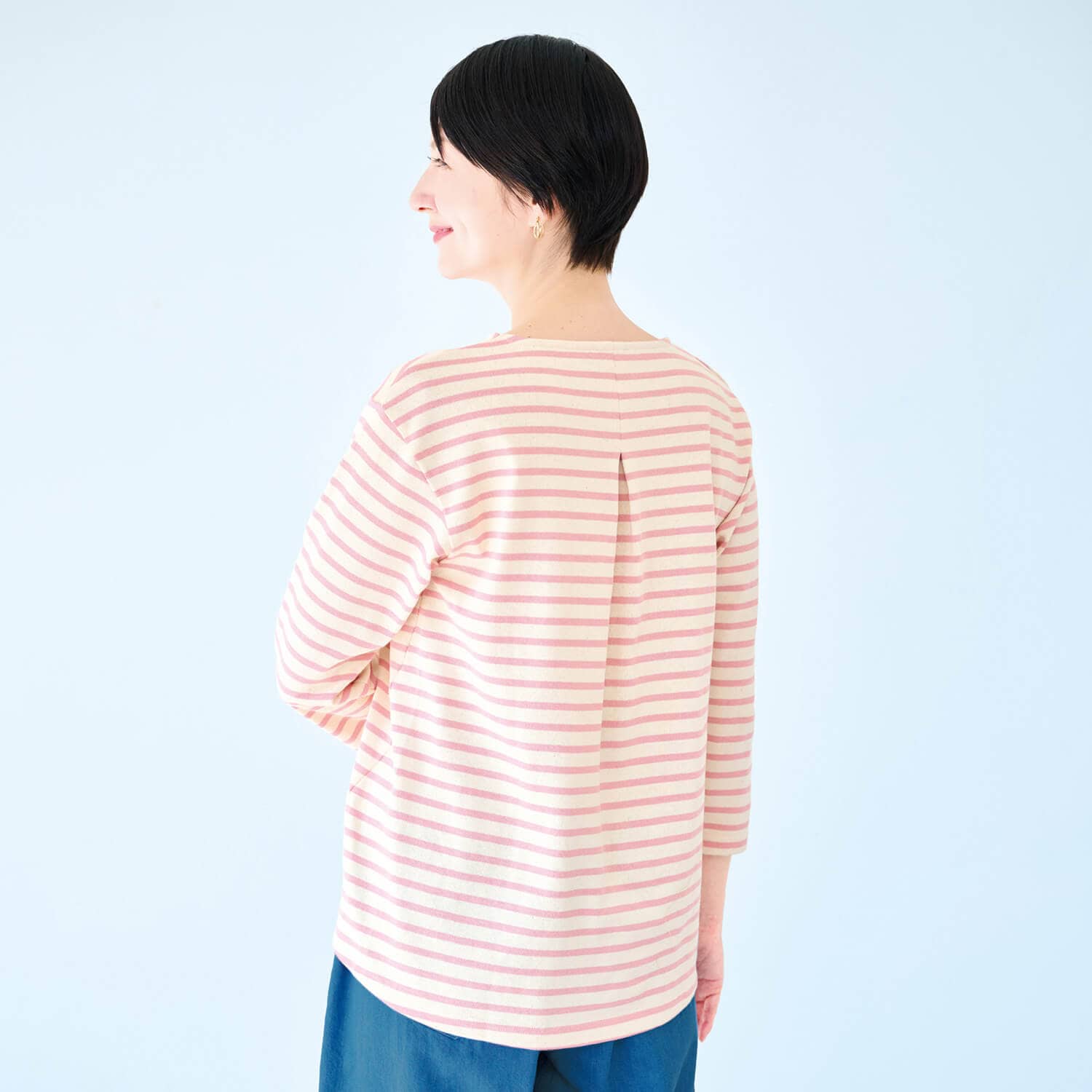 春らしい爽やかなボーダー生地。ほどよい厚みのコットン素材で、春先にぴったりです。脇の切り替えを前振りにしているので自然とほっそり見え。背中のタックでゆったり着られ、長めの丈で体型カバーも叶えます。手もとがすっきり見える短めの袖丈もポイントです。