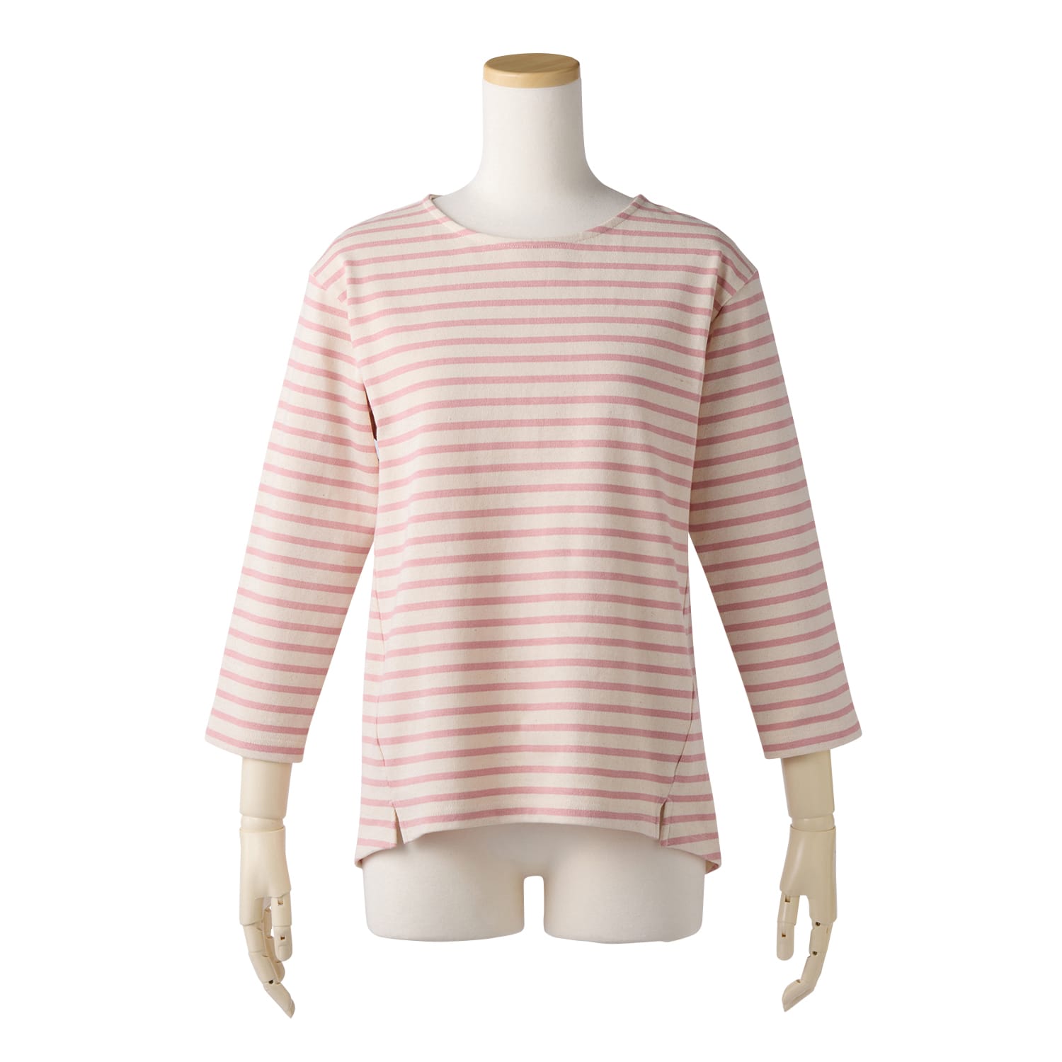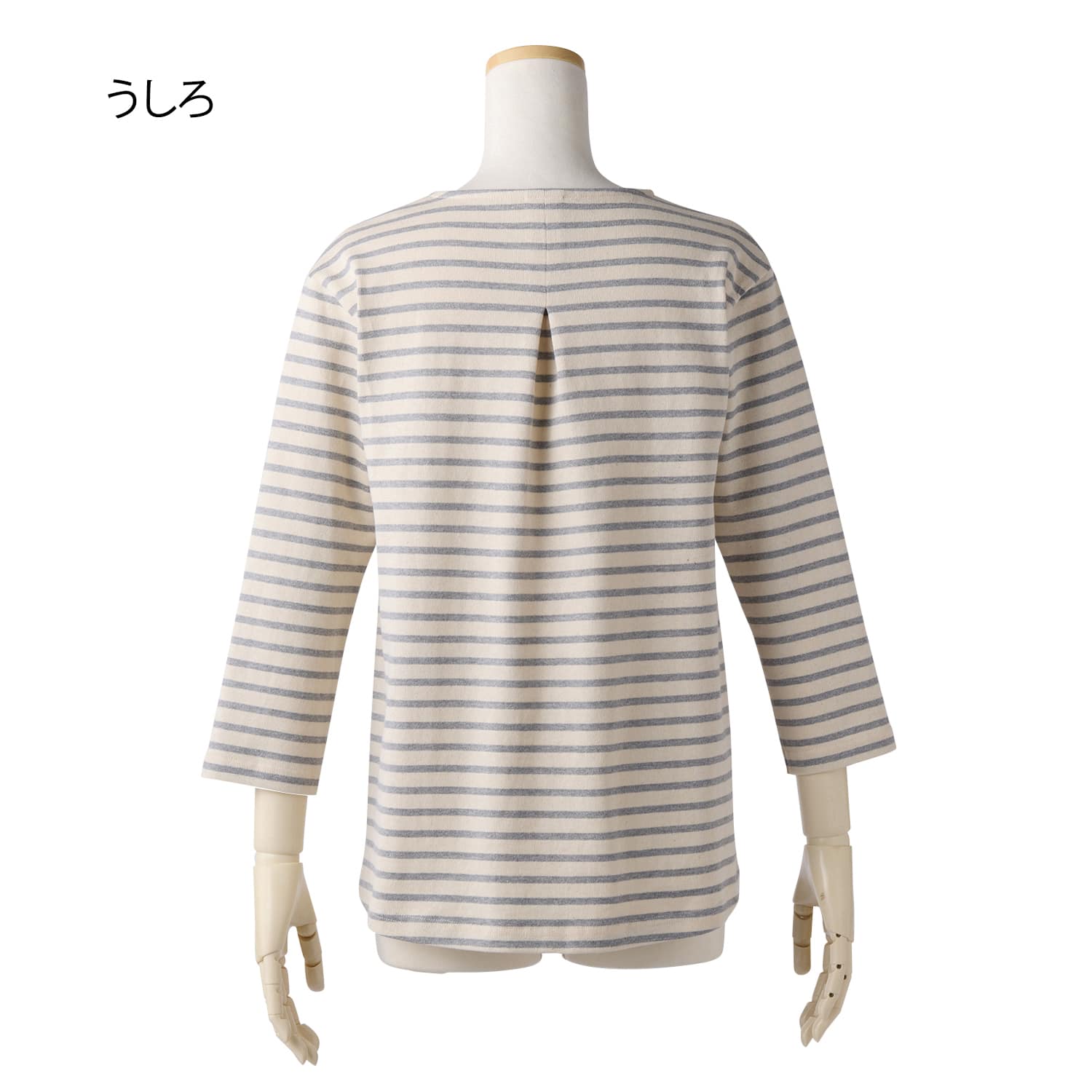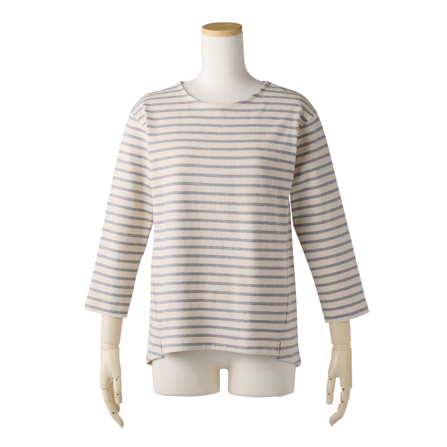 春らしい爽やかなボーダー生地。ほどよい厚みのコットン素材で、春先にぴったりです。脇の切り替えを前振りにしているので自然とほっそり見え。背中のタックでゆったり着られ、長めの丈で体型カバーも叶えます。手もとがすっきり見える短めの袖丈もポイントです。