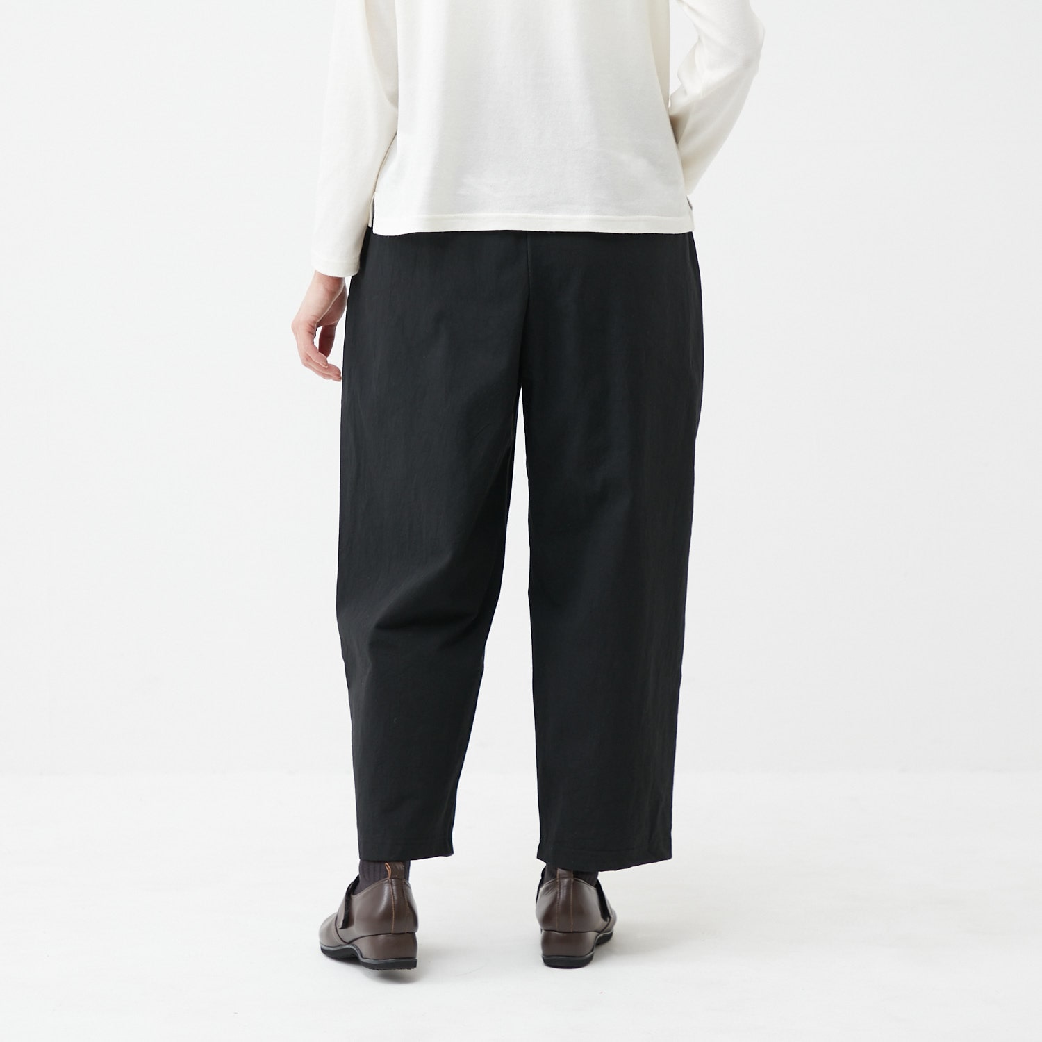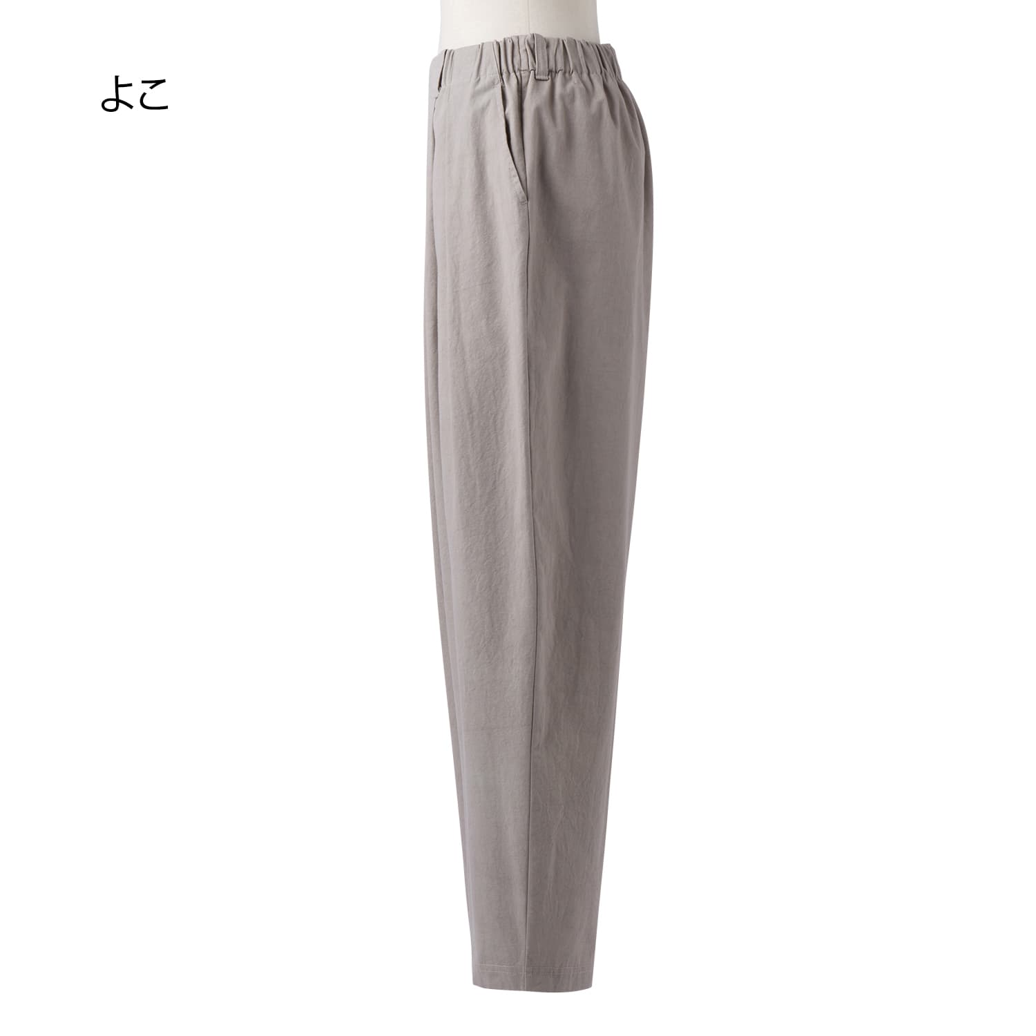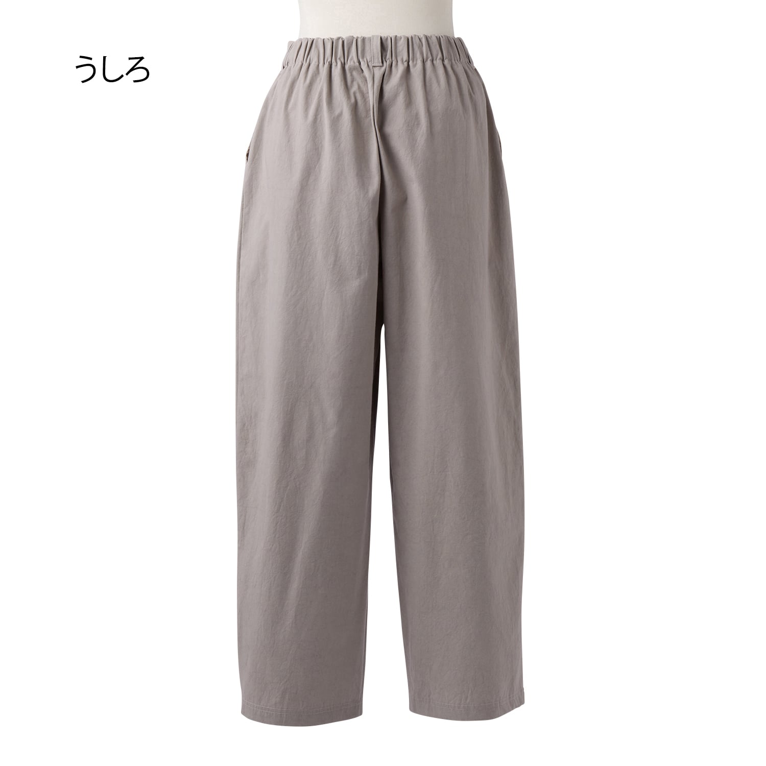 錦織物の一大産地である遠州の職人が染色したコットン生地を使用。天日干しならではのムラ感やシワのある風合いが魅力です。深めのタック入りなので腰回りはゆったり。ウエストは総ゴム仕様で快適です。足首がのぞく絶妙な丈感で、軽やかですっきりとした印象に。