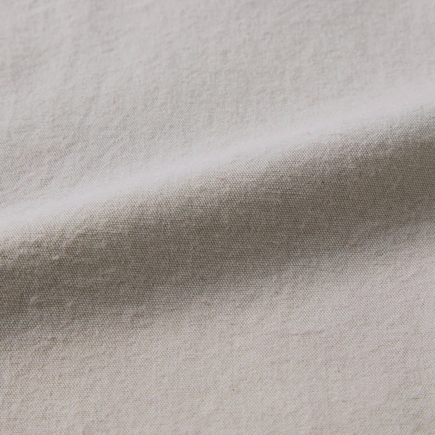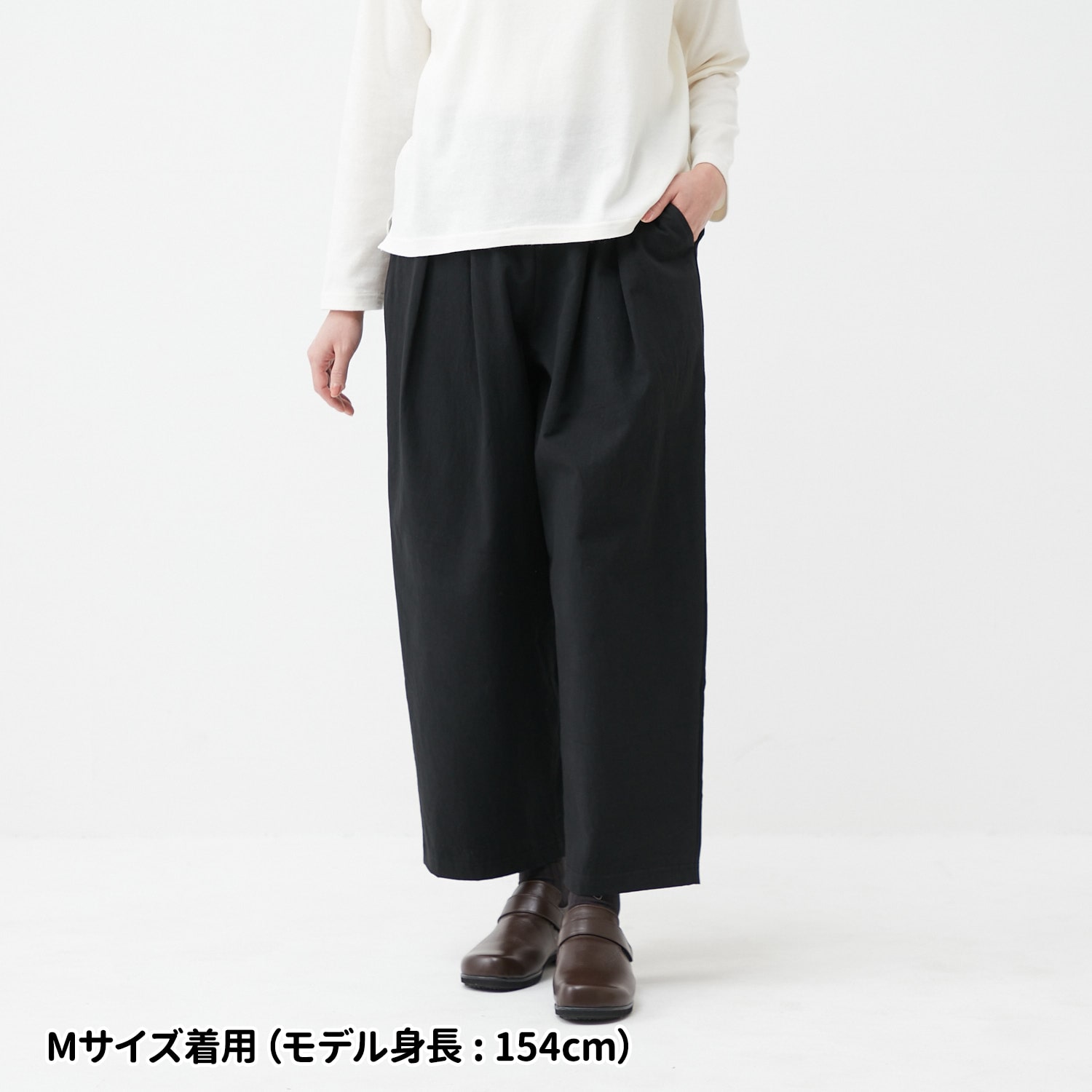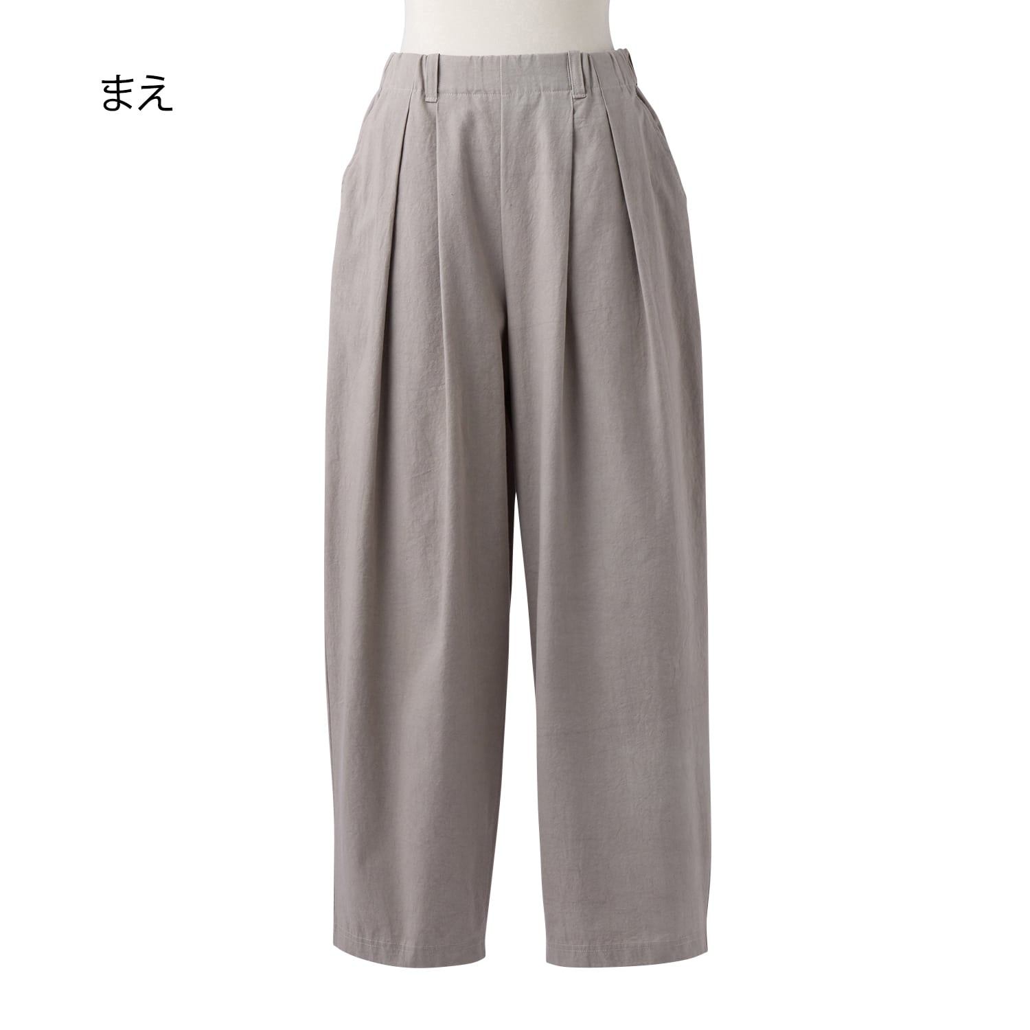 錦織物の一大産地である遠州の職人が染色したコットン生地を使用。天日干しならではのムラ感やシワのある風合いが魅力です。深めのタック入りなので腰回りはゆったり。ウエストは総ゴム仕様で快適です。足首がのぞく絶妙な丈感で、軽やかですっきりとした印象に。