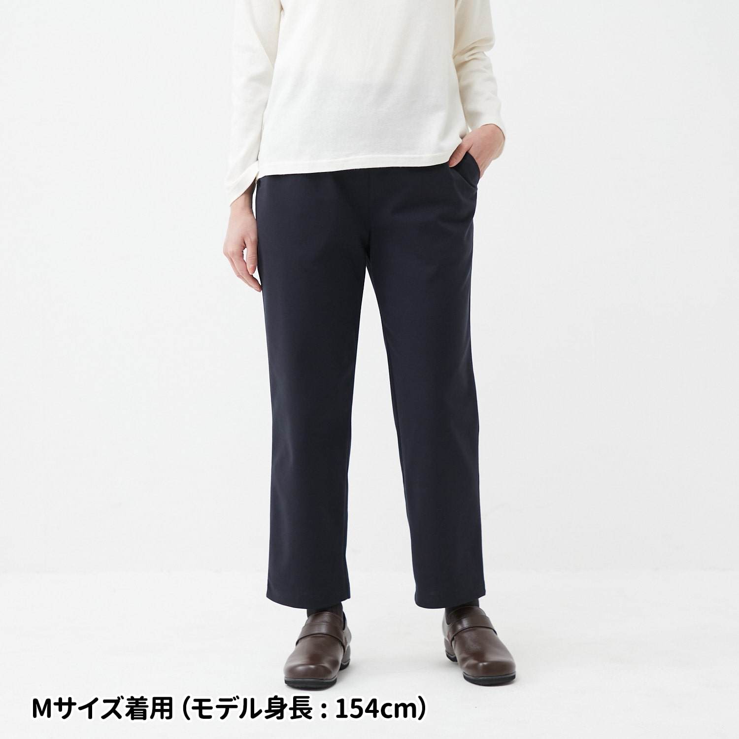 自然な光沢のあるしっかりとしたカットソー生地と、すっきりシルエットが人気の定番パンツ。伸縮性が良く動きやすさも抜群。ウエストゴム仕様で楽ちんながら、ベルトループ付きできちんと見えが叶います。ストレートシルエットで脚のラインを拾いにくく、どんなトップスとも相性良く合わせられます。