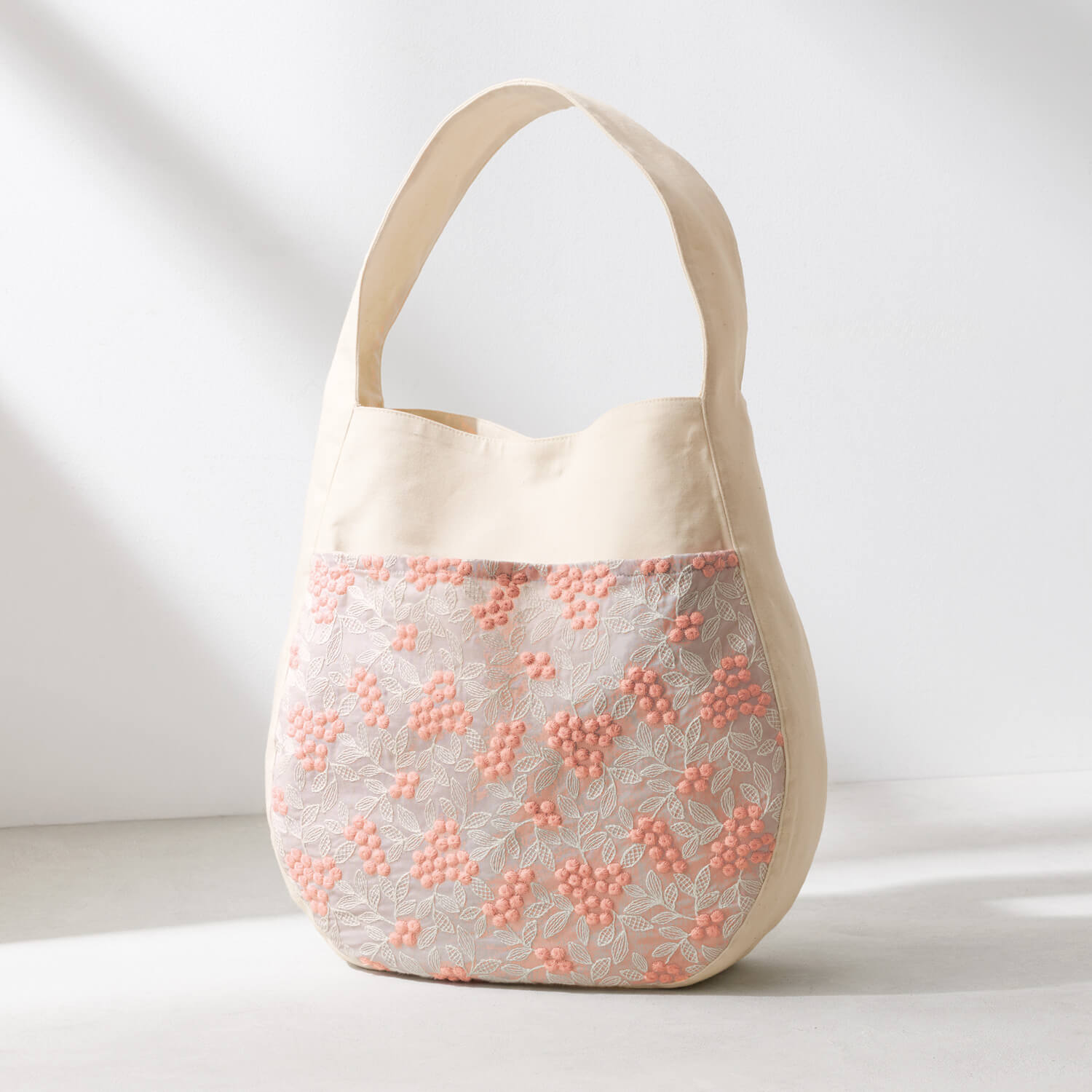 丸みを帯びたシルエットが女性らしい印象の布バッグ。外側にあるポケットの全面に施した繊細な花模様の刺繍が、装いに春らしい華やぎを添えます。肩掛けも手持ちもできるデザインで幅広く活躍します。開口部はマグネットホック付きで安心。