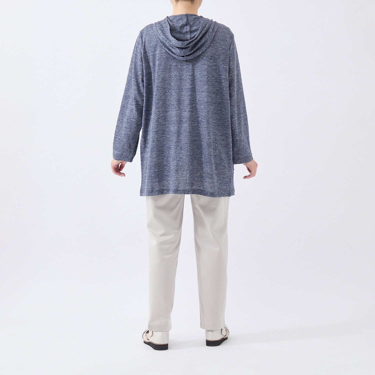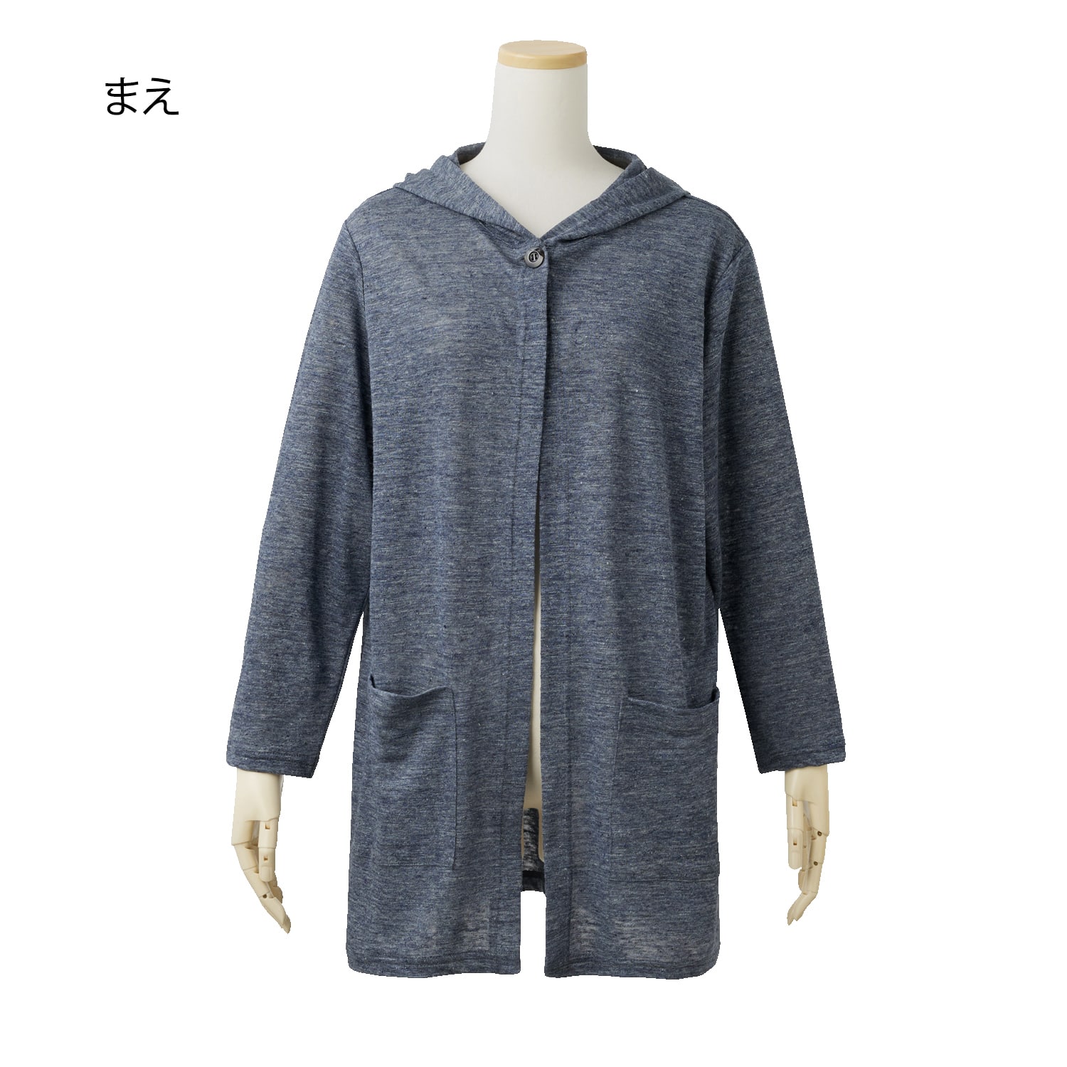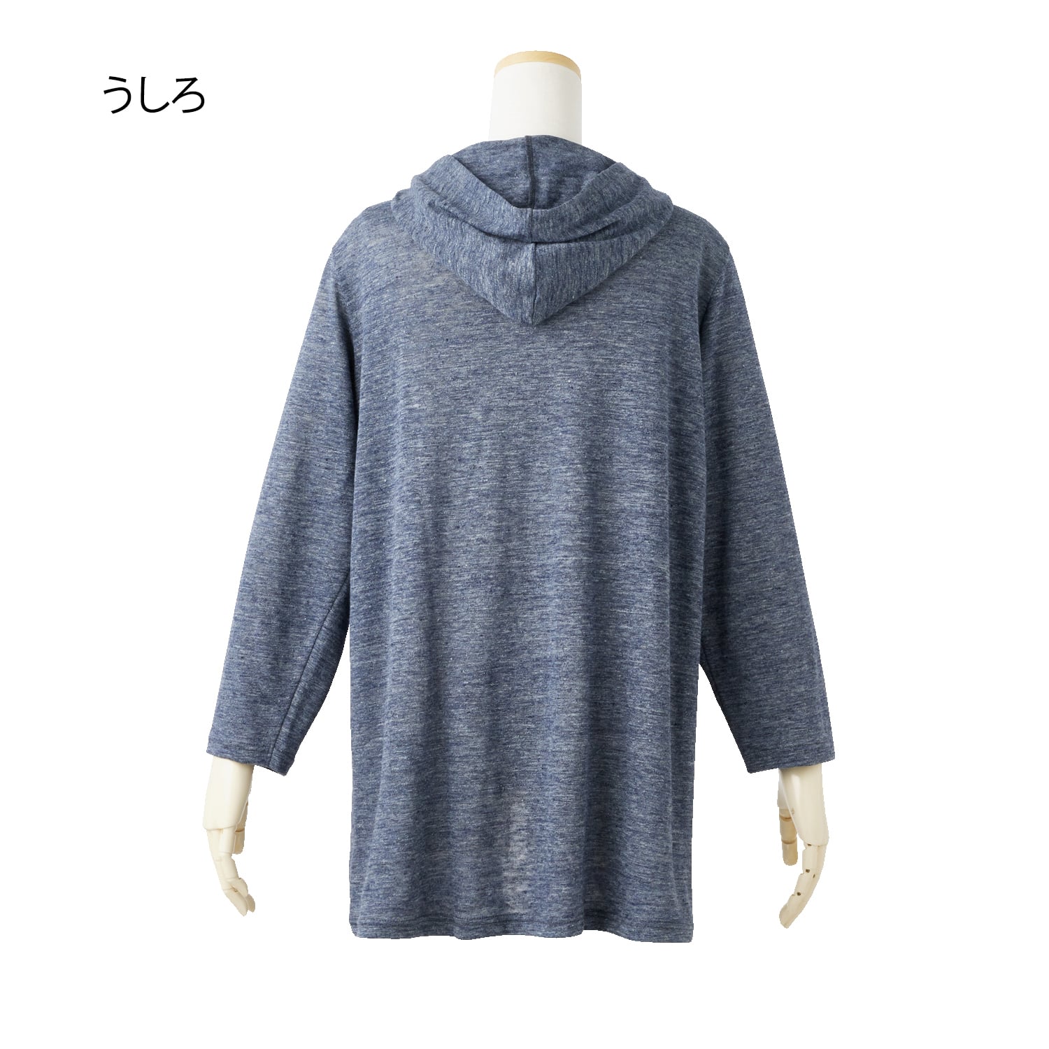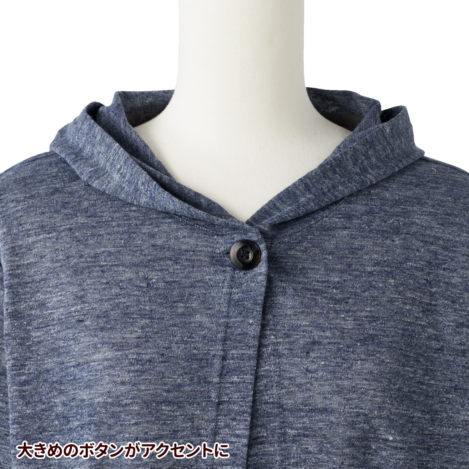 厳選したリネンを使用し、丁寧に編み立てたカットソー生地。リネンの自然な質感を活かしながら、チクチクしない柔らかな風合いに仕上げました。フード付きでカジュアルに見せつつ、きれいな杢(もく)感が上品な印象を演出。日除けや体型カバーにも嬉しい長めの丈感です。大きめのボタンもアクセントに。