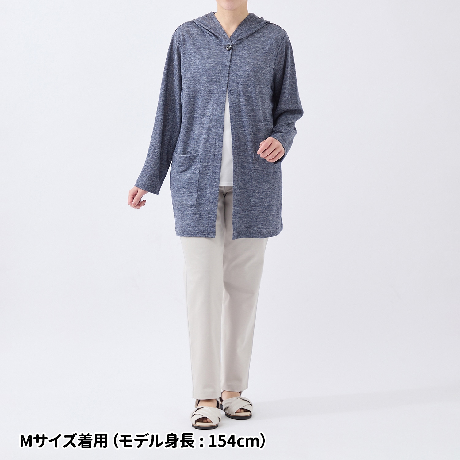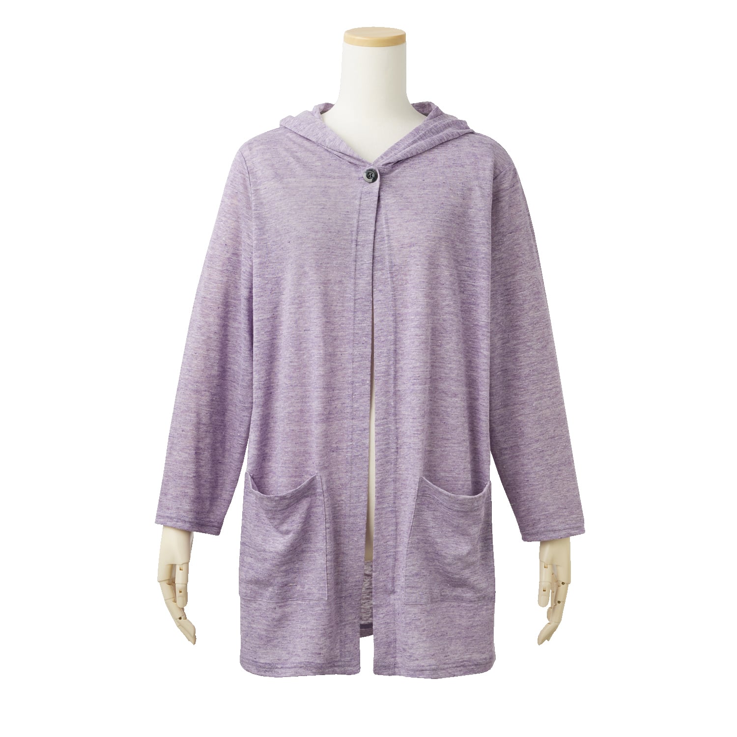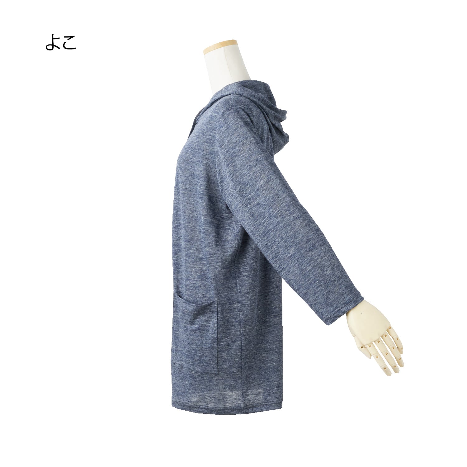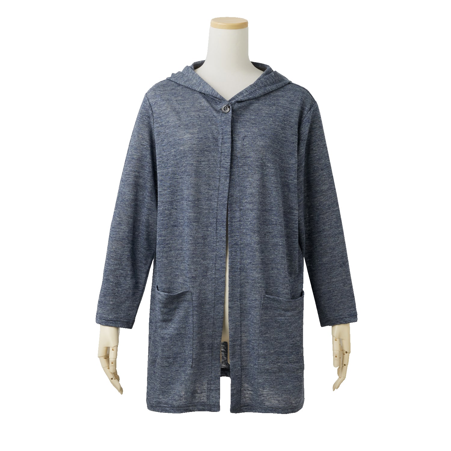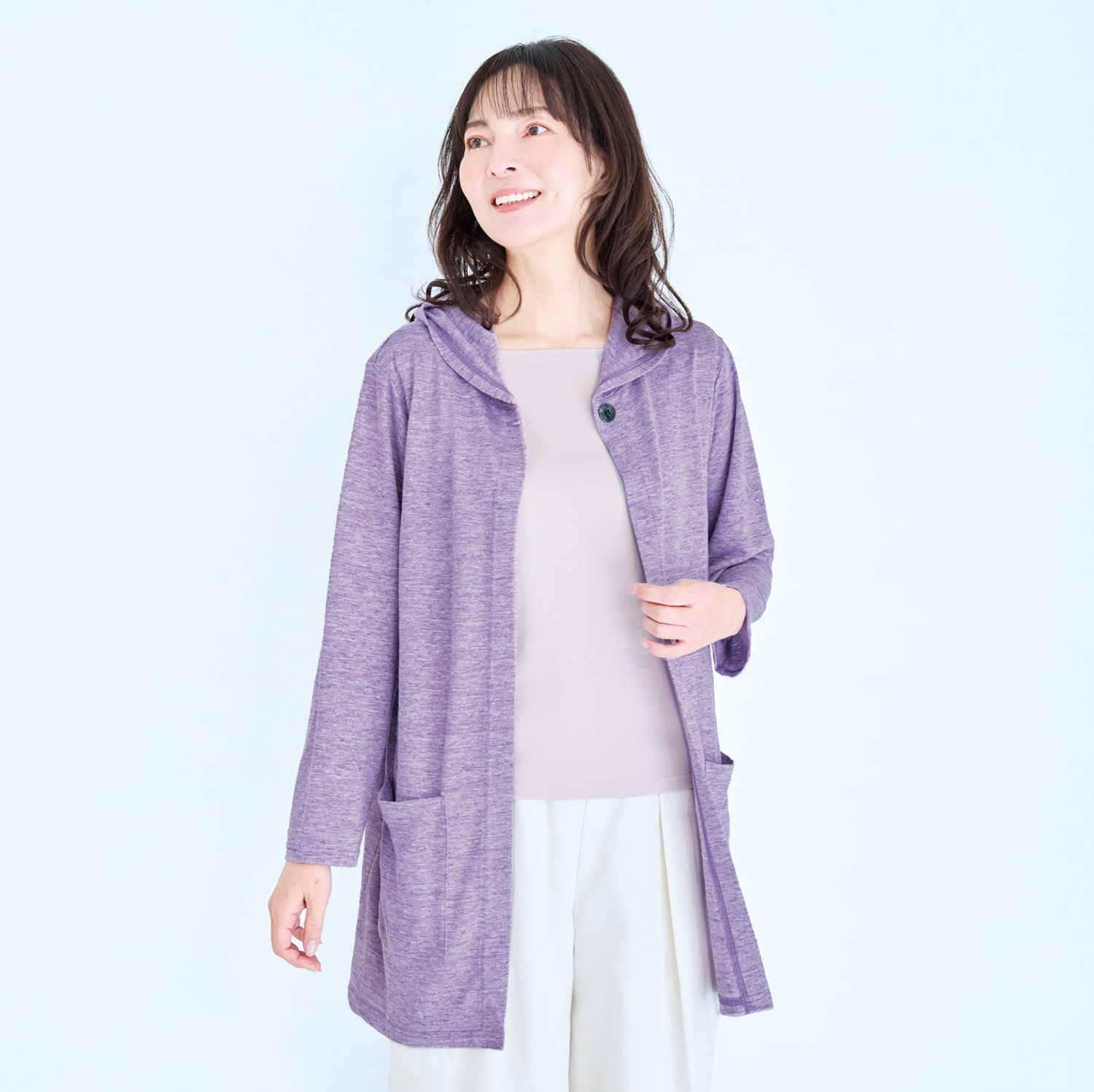 厳選したリネンを使用し、丁寧に編み立てたカットソー生地。リネンの自然な質感を活かしながら、チクチクしない柔らかな風合いに仕上げました。フード付きでカジュアルに見せつつ、きれいな杢(もく)感が上品な印象を演出。日除けや体型カバーにも嬉しい長めの丈感です。大きめのボタンもアクセントに。