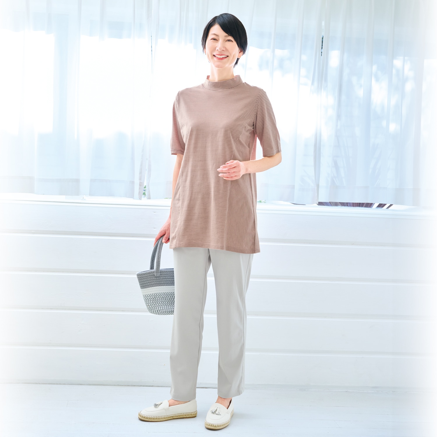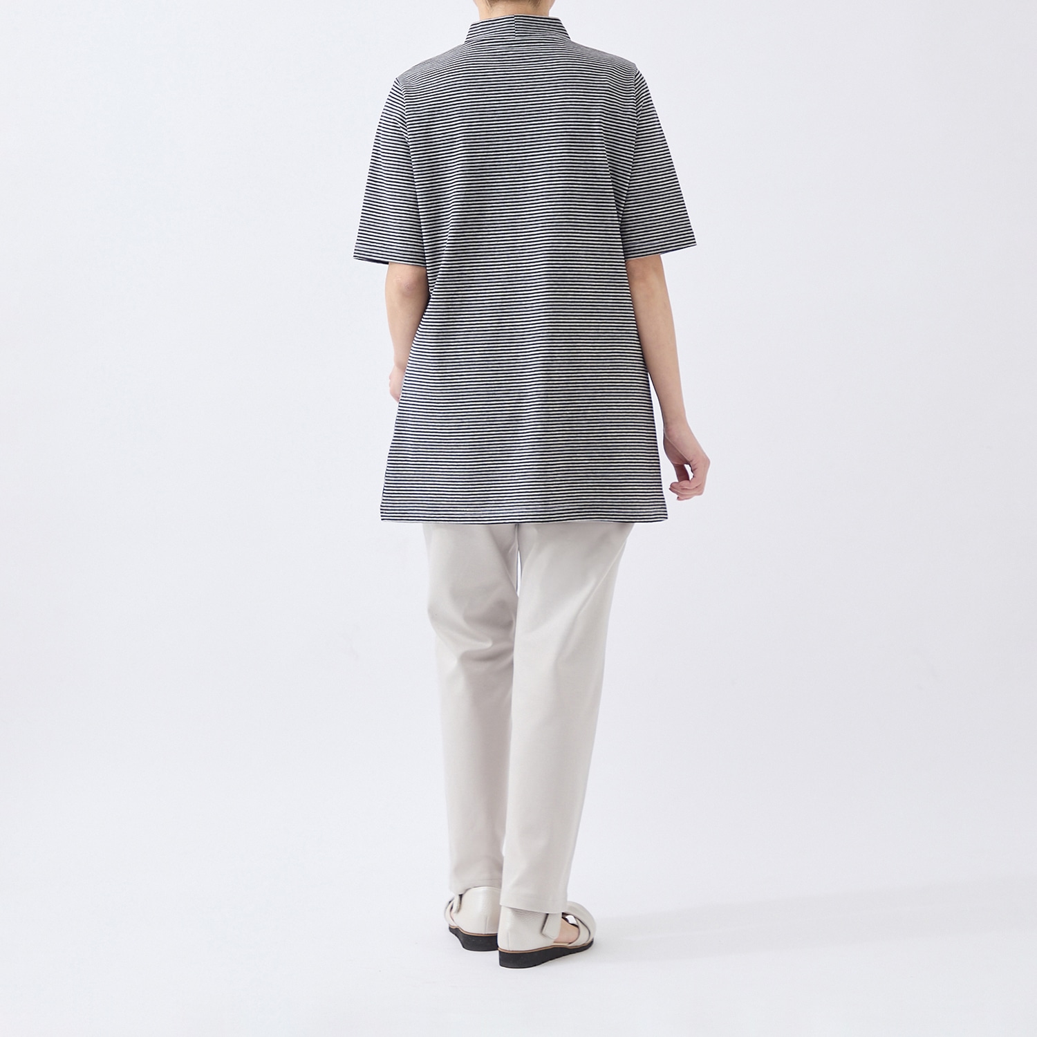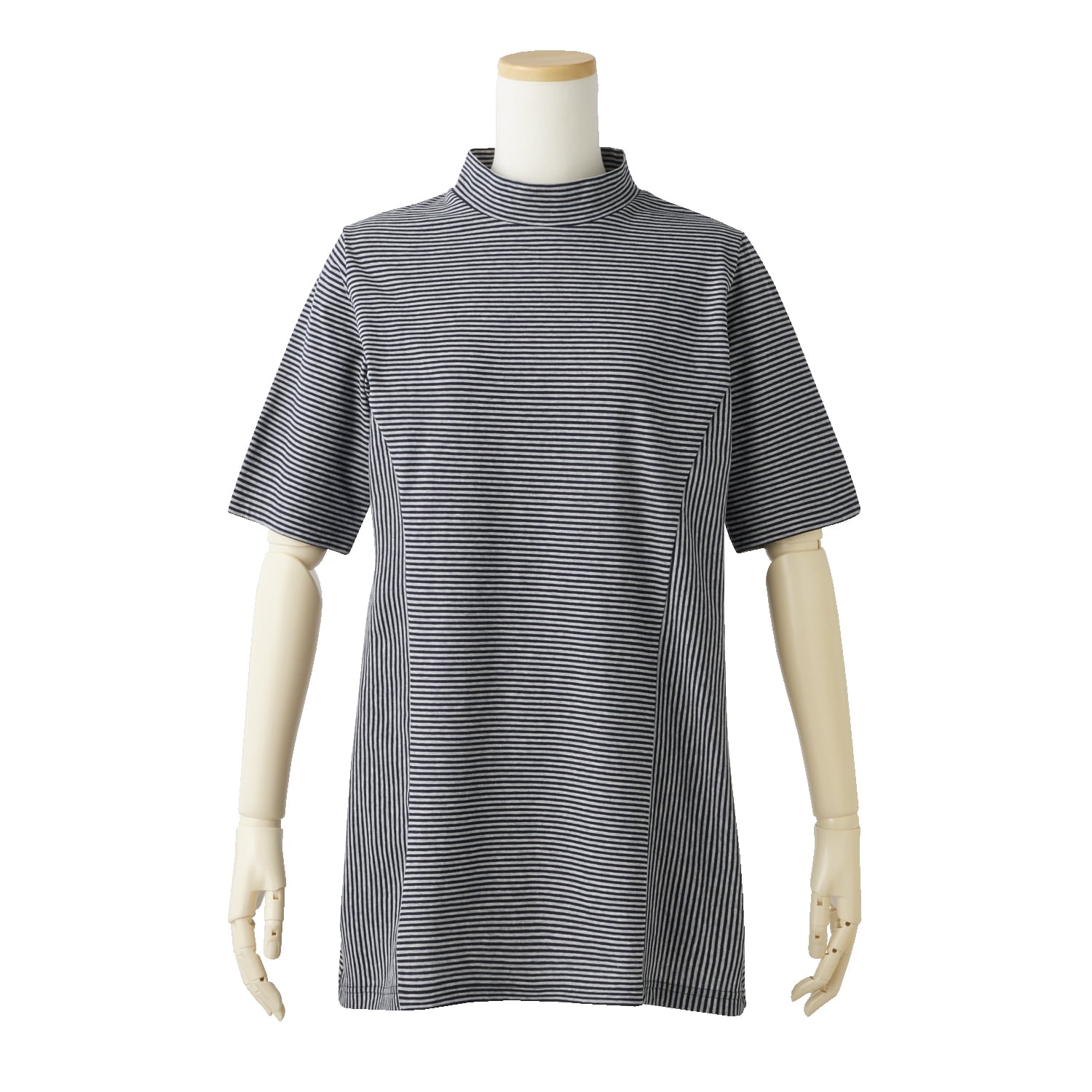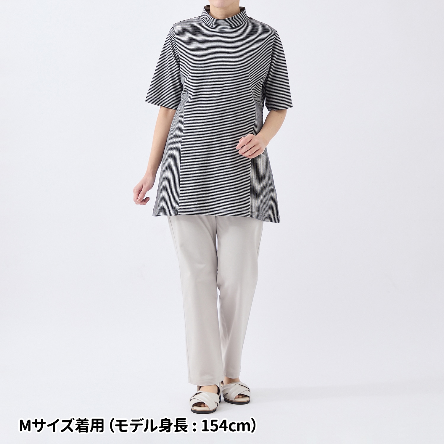 希少な編み機で丁寧に編まれた生地を使ったチュニック。肌離れの良い強撚糸を使用しているのでひんやり涼しく、夏にぴったりの着心地。縦と横に組み合わせたストライプ使いでほっそり見えを叶えます。顔回りをすっきり見せるハイネックは首もとの日焼け防止にも一役。五分袖で気になる二の腕もカバーします。