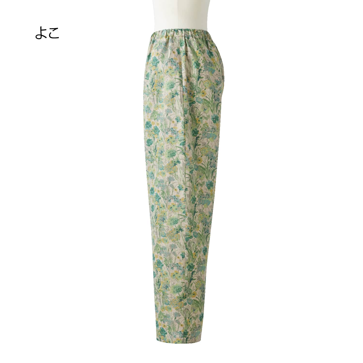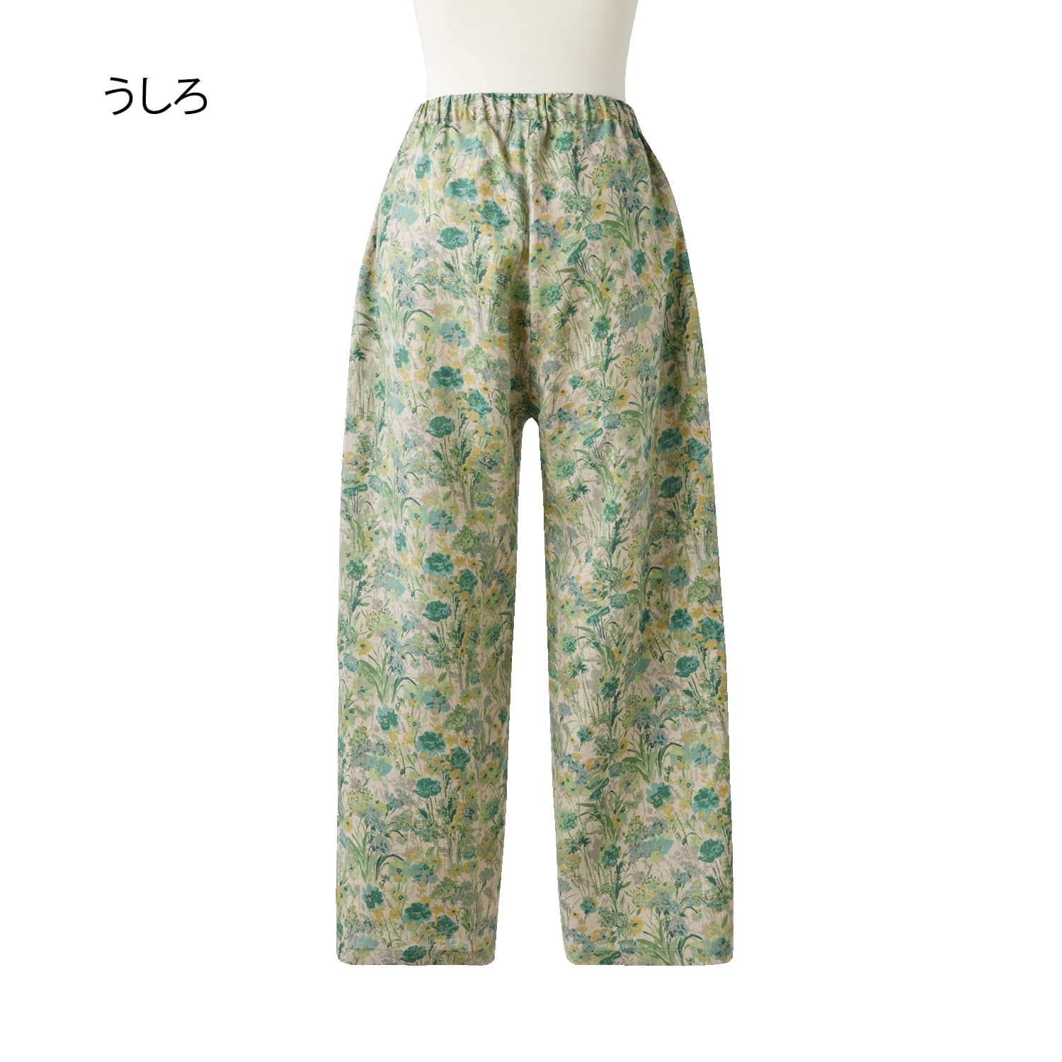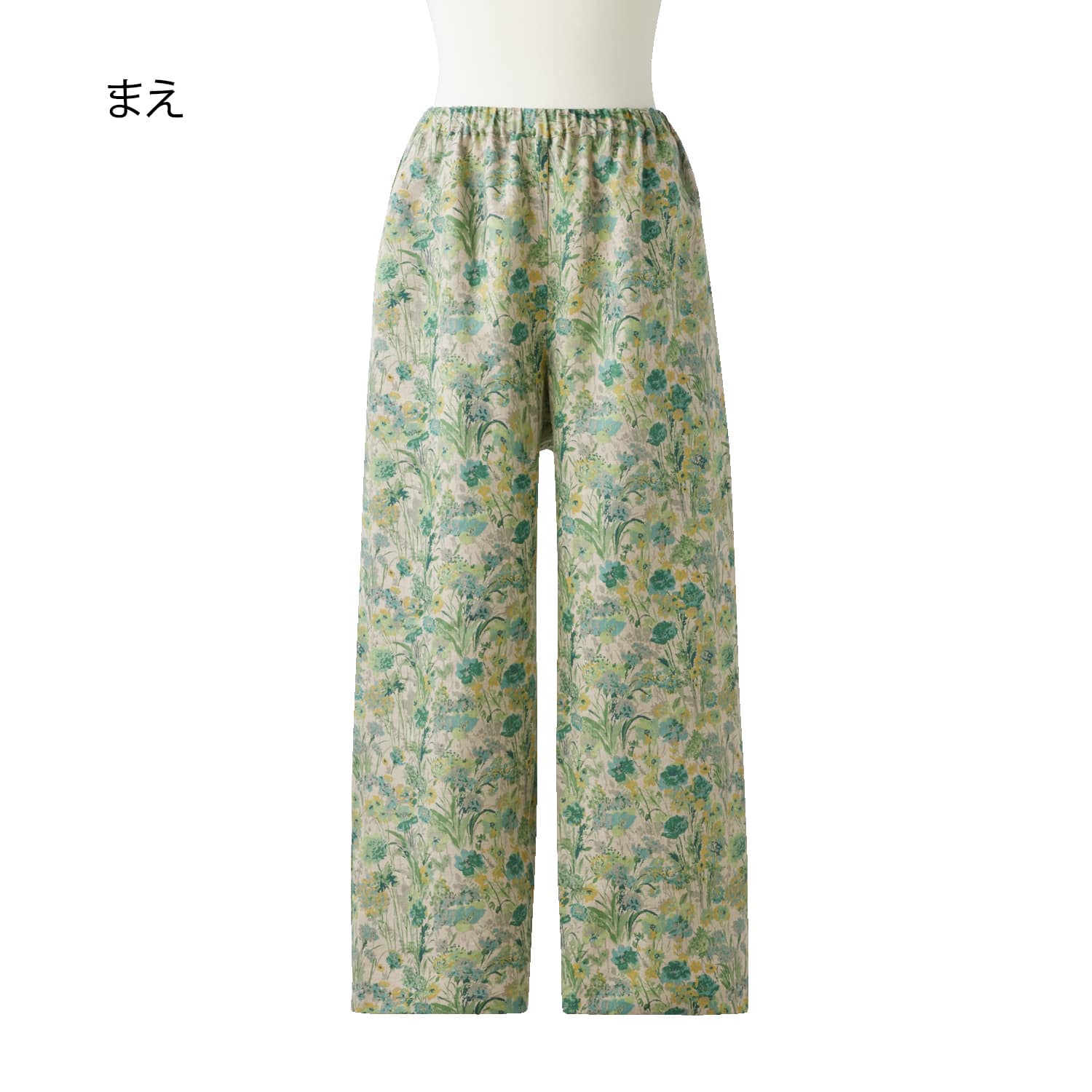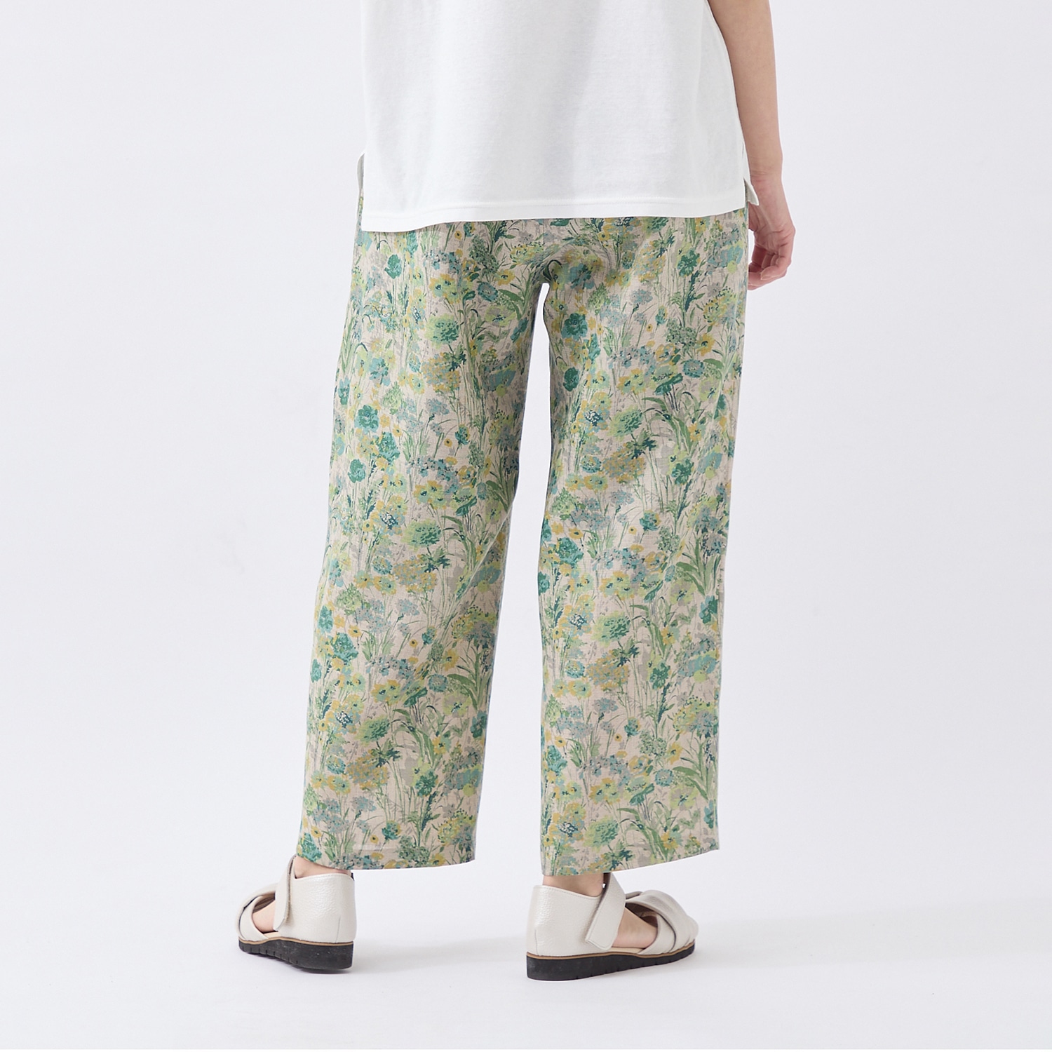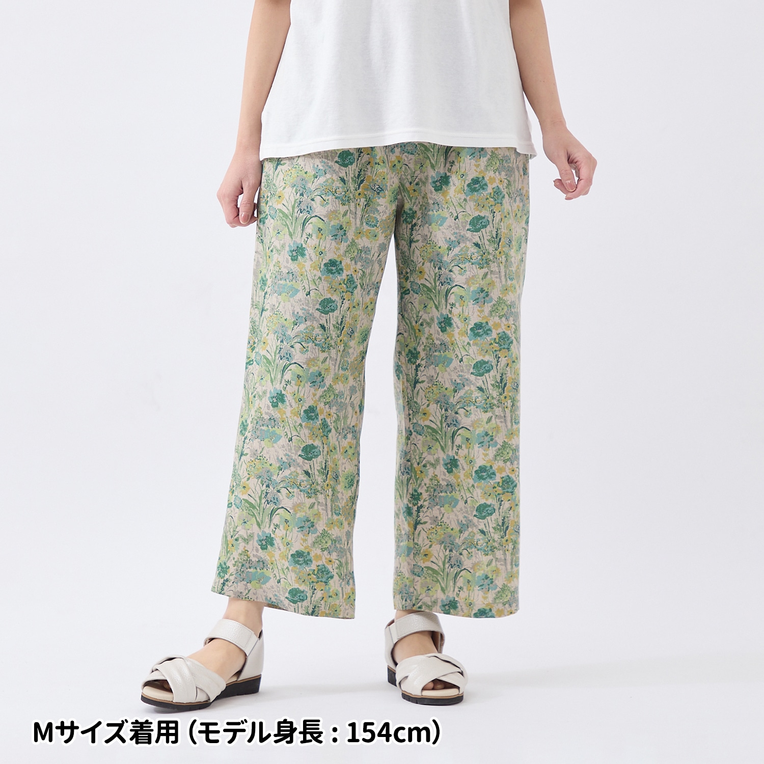水彩タッチのリバティプリントが目を引くパンツ。リネン100%の生地に特別なソフト加工を施すことで、とびきり柔らかな風合いに仕上げました。リネンならではの清涼感と優しい肌当たりの両方を感じられます。足首が見える丈感で、ゆとりがありながらすっきり見えるシルエット。ウエストは総ゴム仕様で楽らくです。