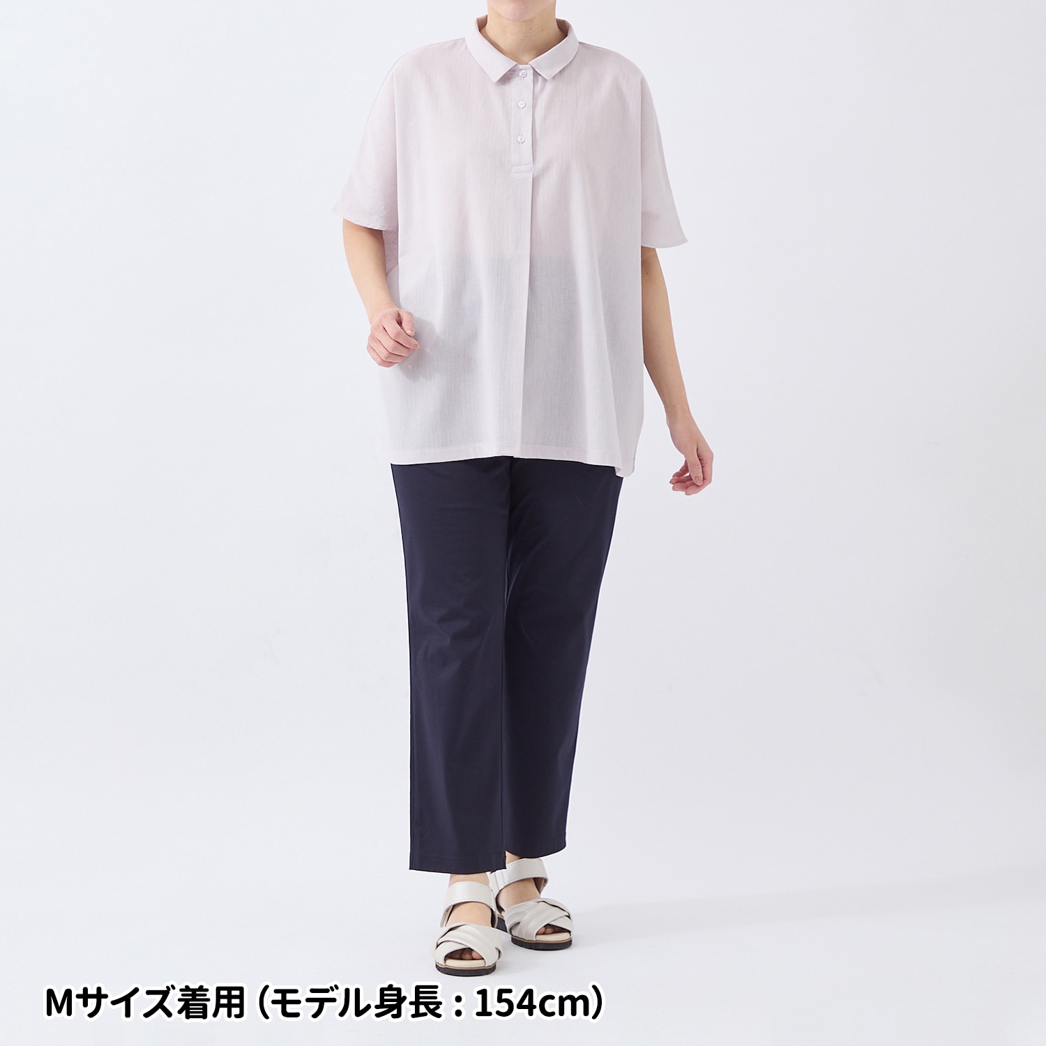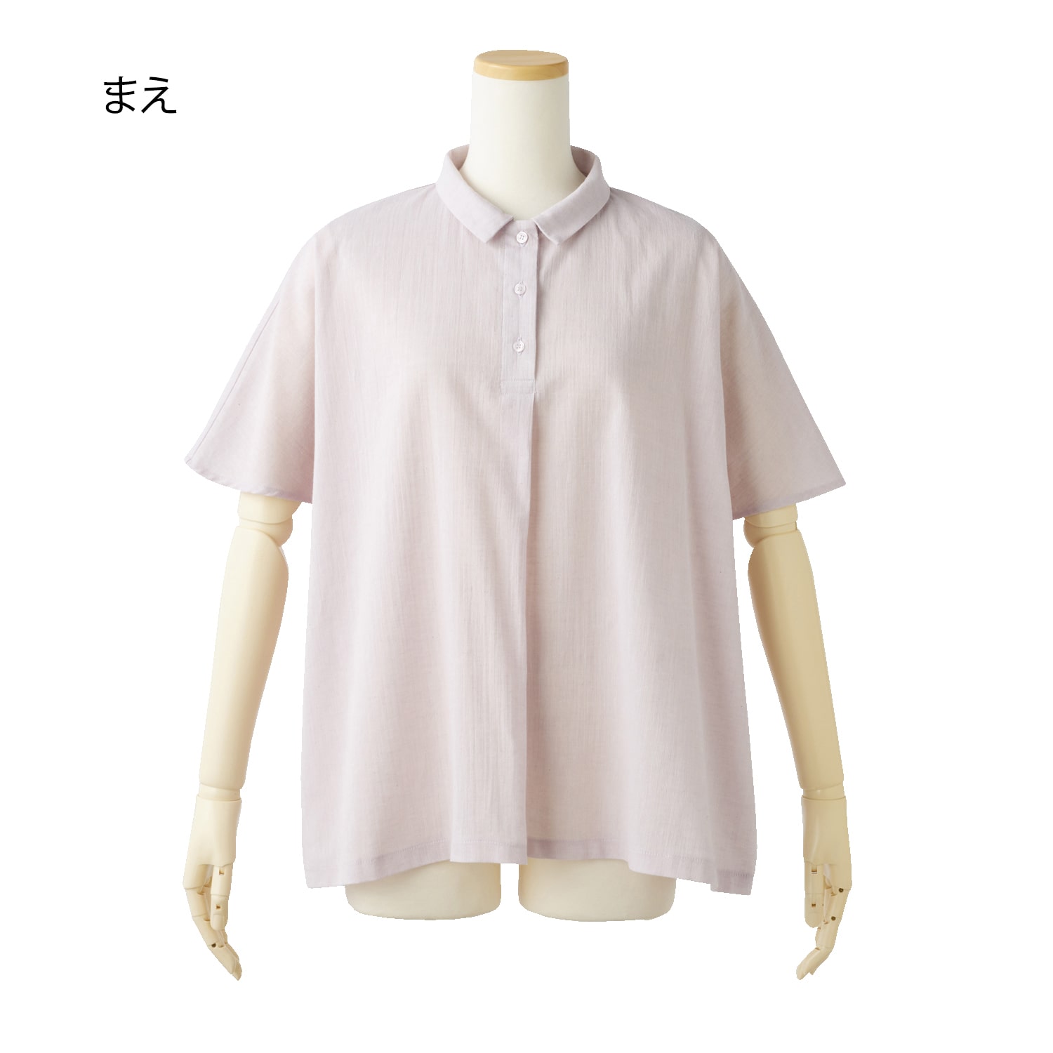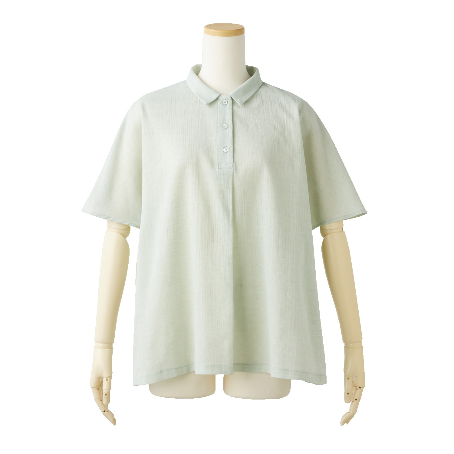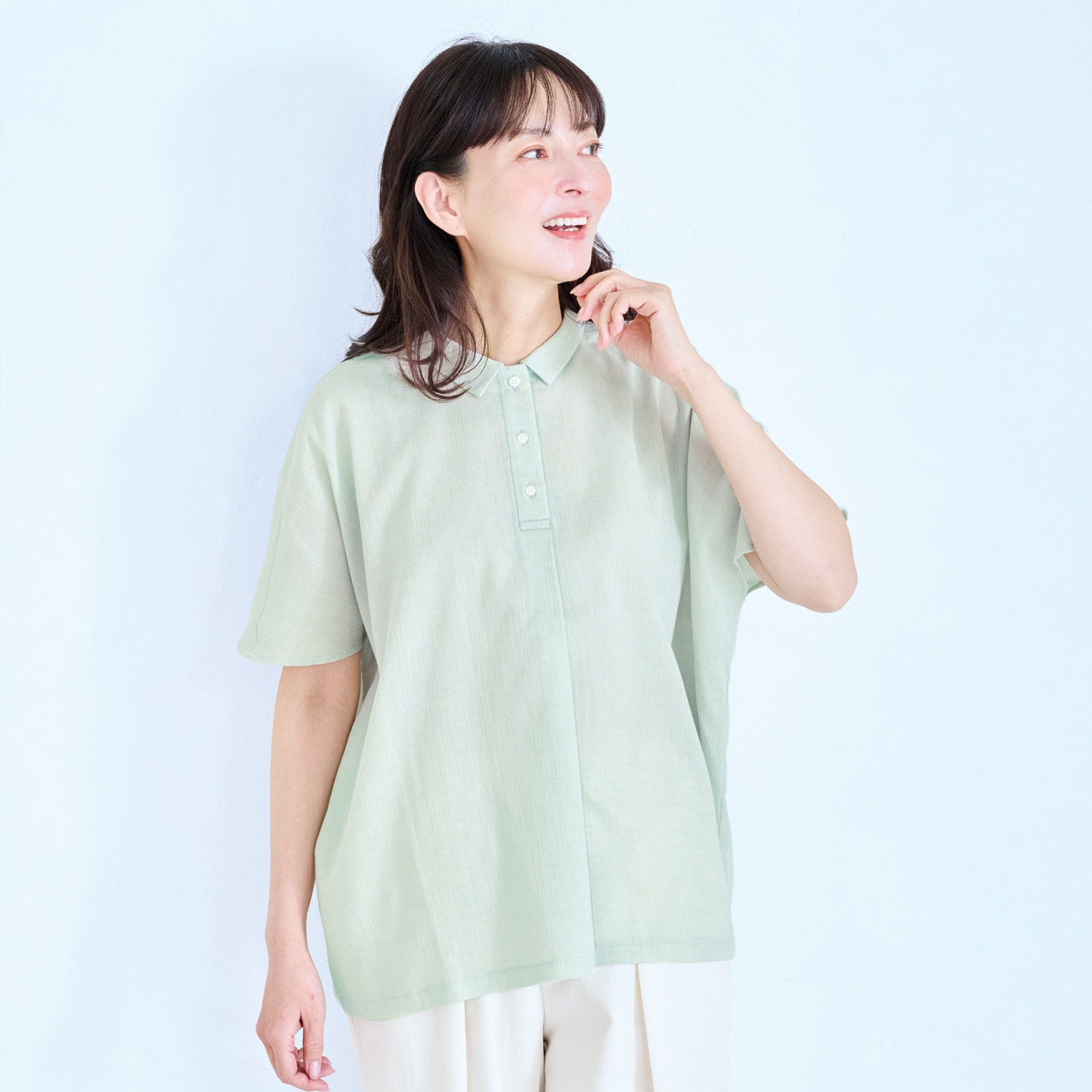 生地の表面に凹凸があり、さらりとした肌触りでムレにくく快適。麻混素材なのでより肌離れが良く、涼しく着られます。ゆったりとしたシルエットでお腹回りも楽な着心地。小さめの衿付きできちんと感も演出します。