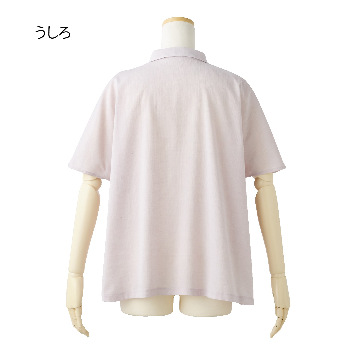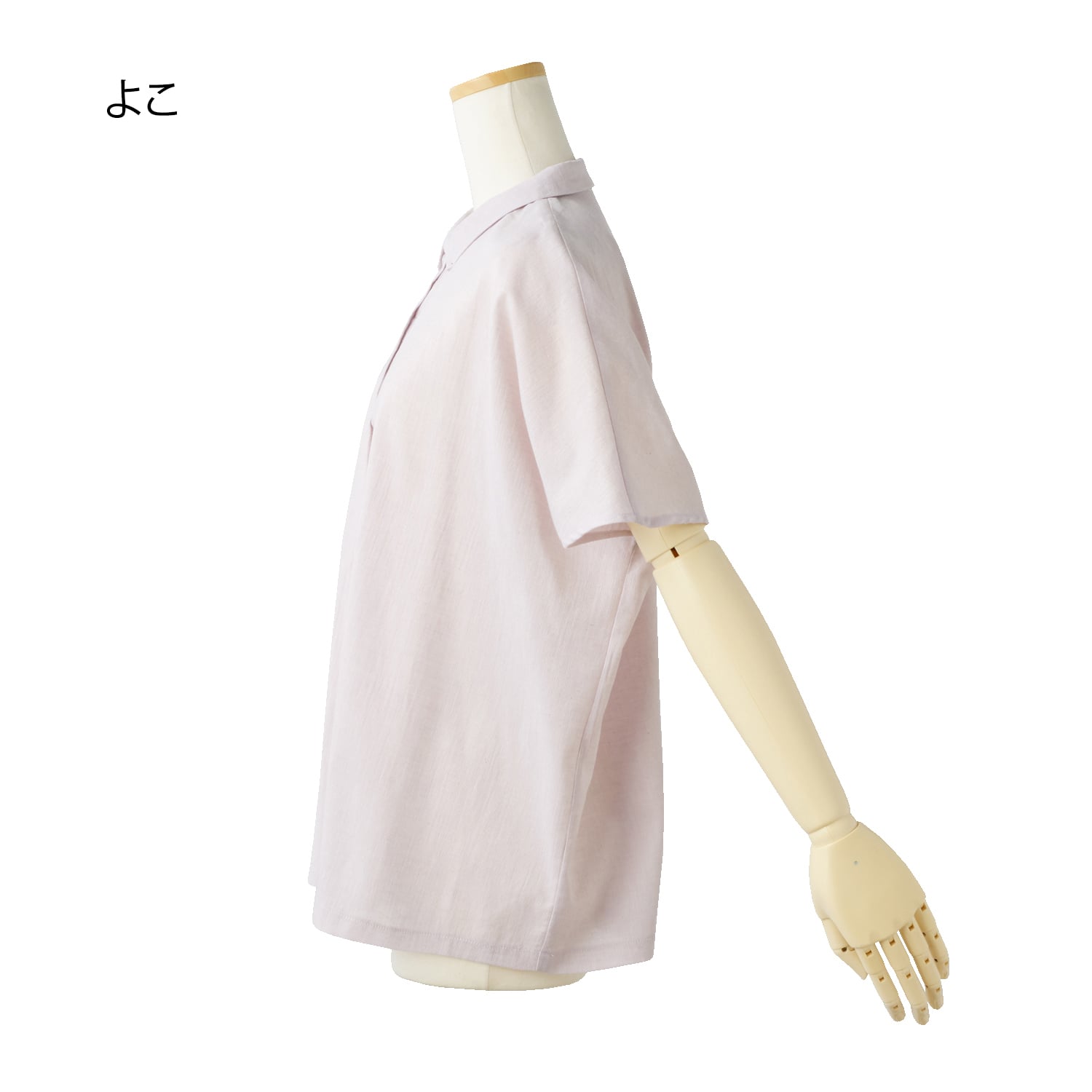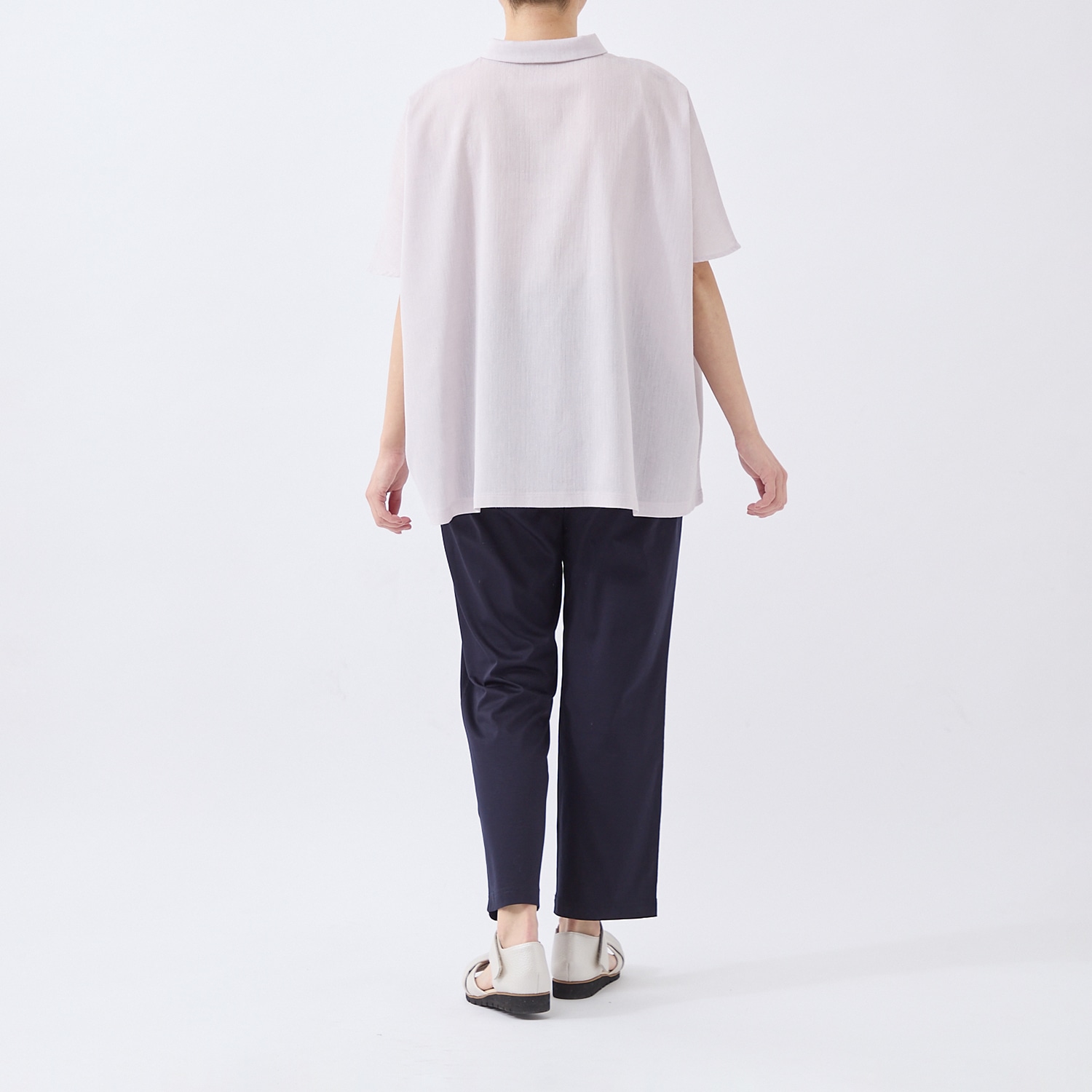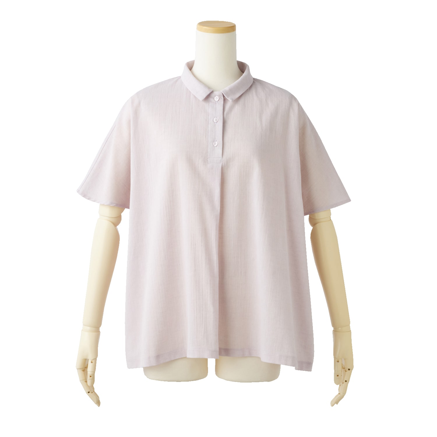 生地の表面に凹凸があり、さらりとした肌触りでムレにくく快適。麻混素材なのでより肌離れが良く、涼しく着られます。ゆったりとしたシルエットでお腹回りも楽な着心地。小さめの衿付きできちんと感も演出します。