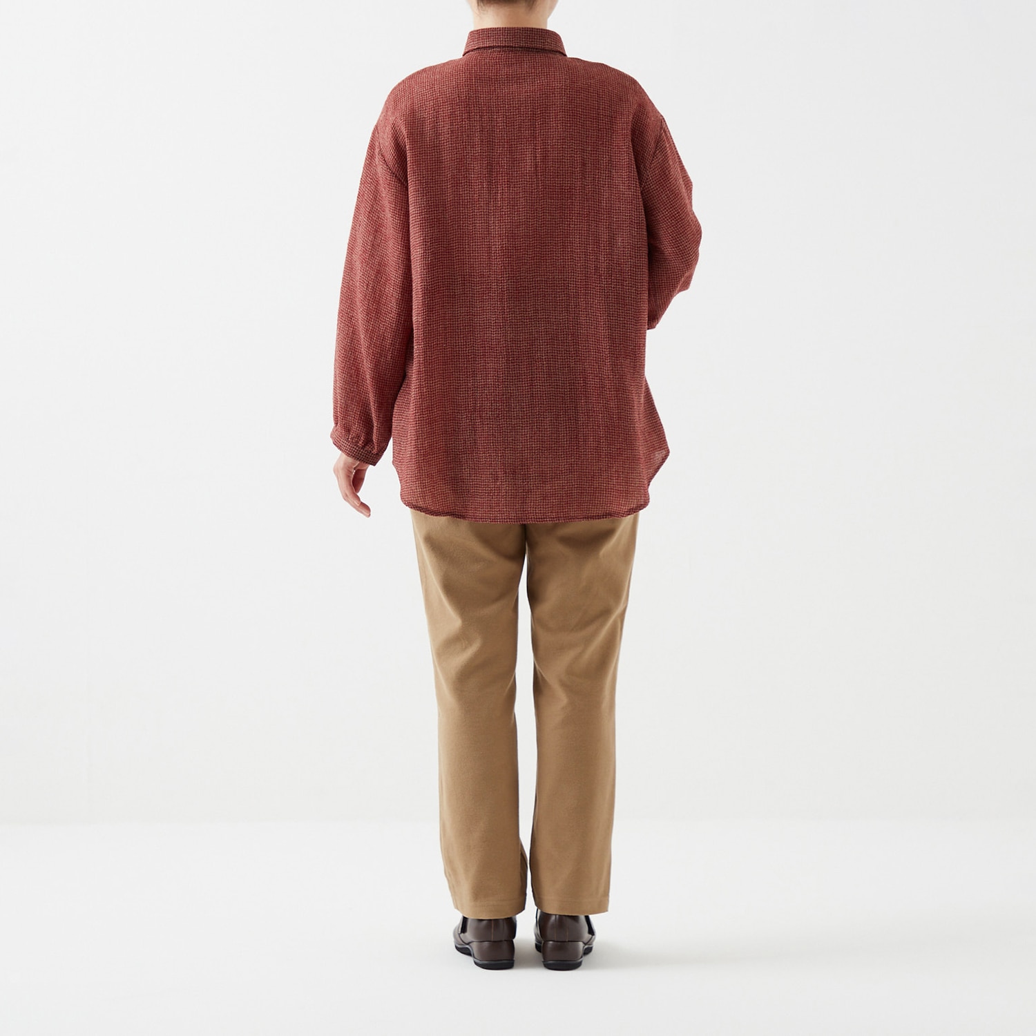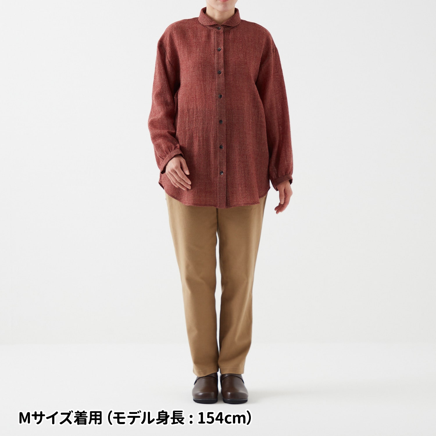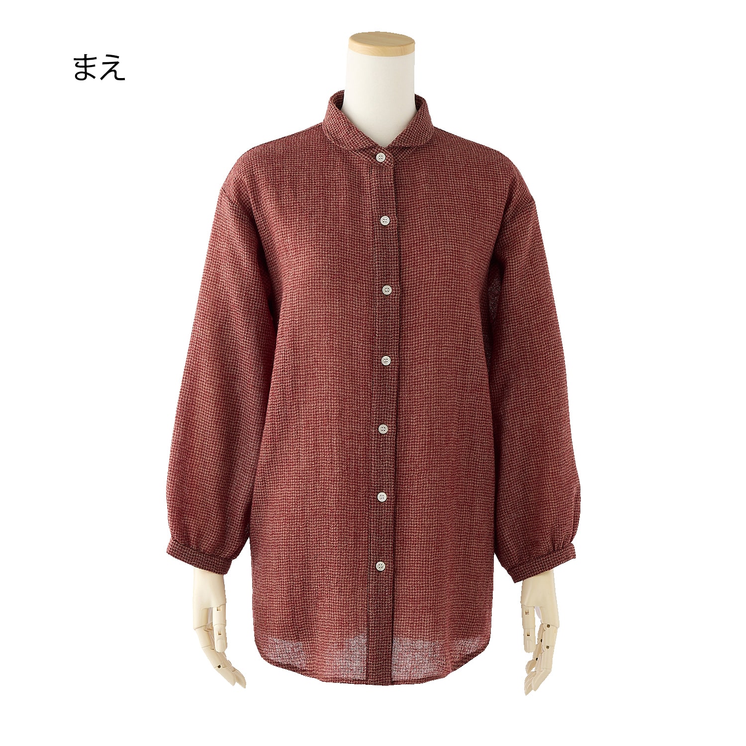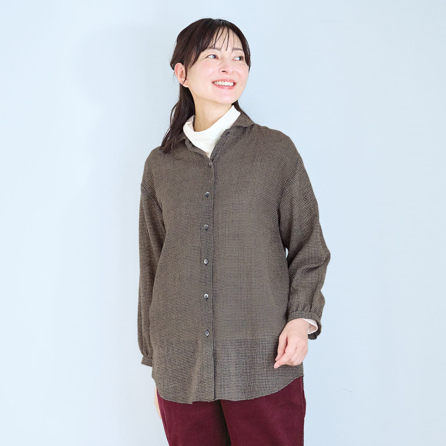 柔らかく繊細なウールガーゼを使用。ふわりと軽く暖かな着心地です。細かな千鳥柄なので派手にならず、幅広く着回せます。小さな丸衿が上品な印象。裾に丸みのある長めのチュニック丈で、気になる腰回りをさりげなくカバーします。前開きボタンで着脱も楽ちん。