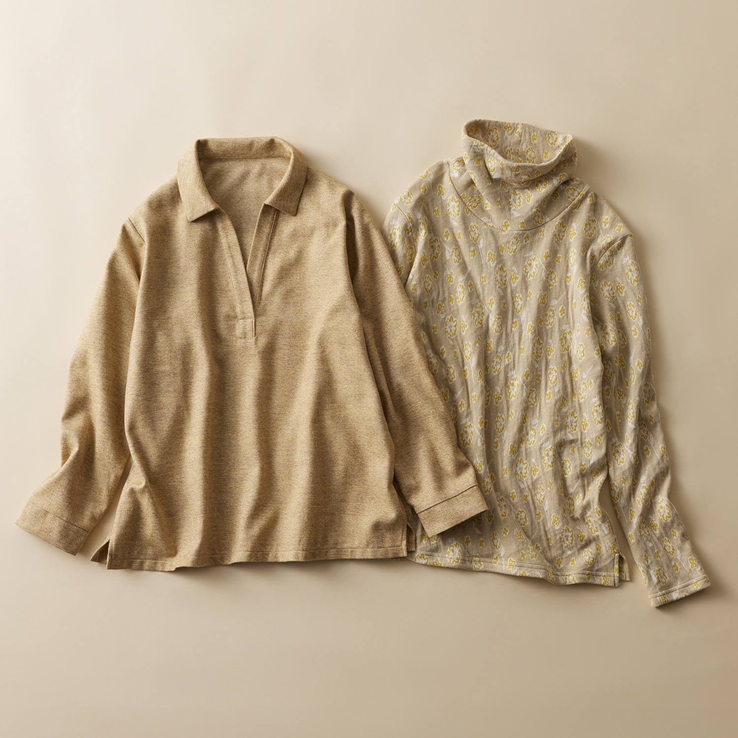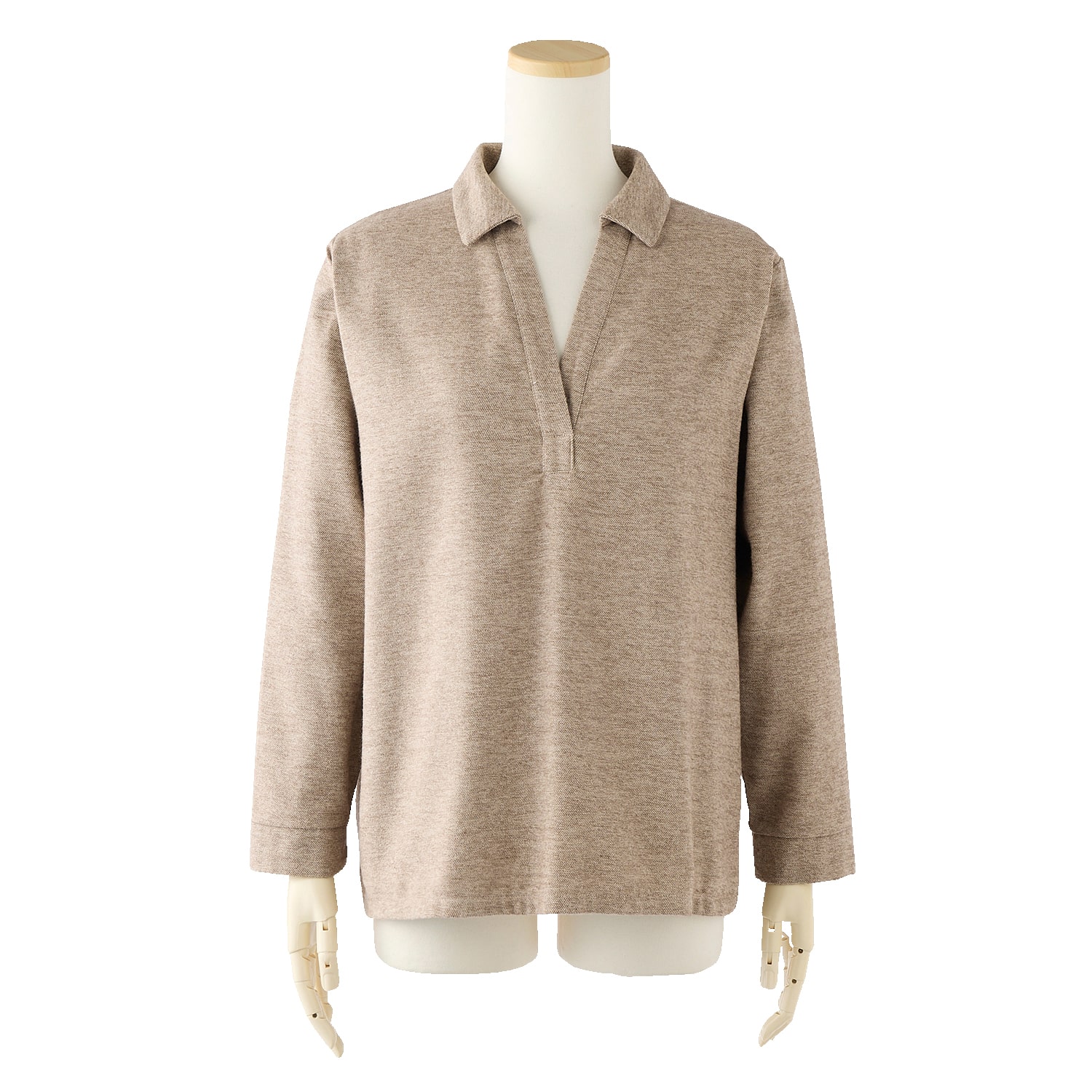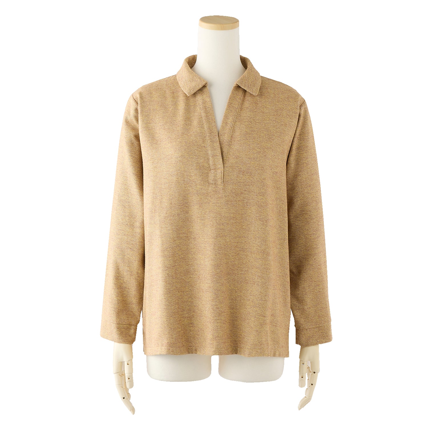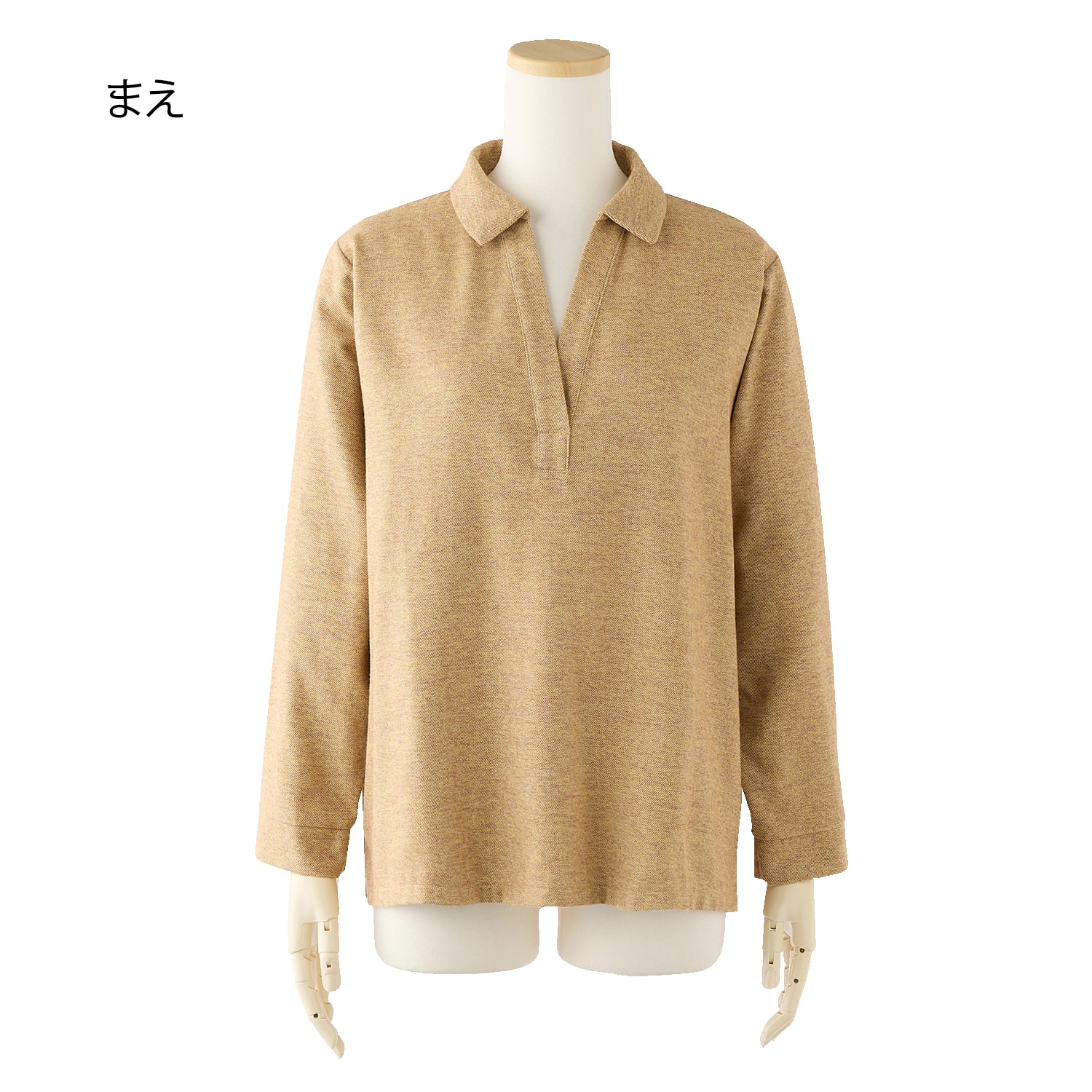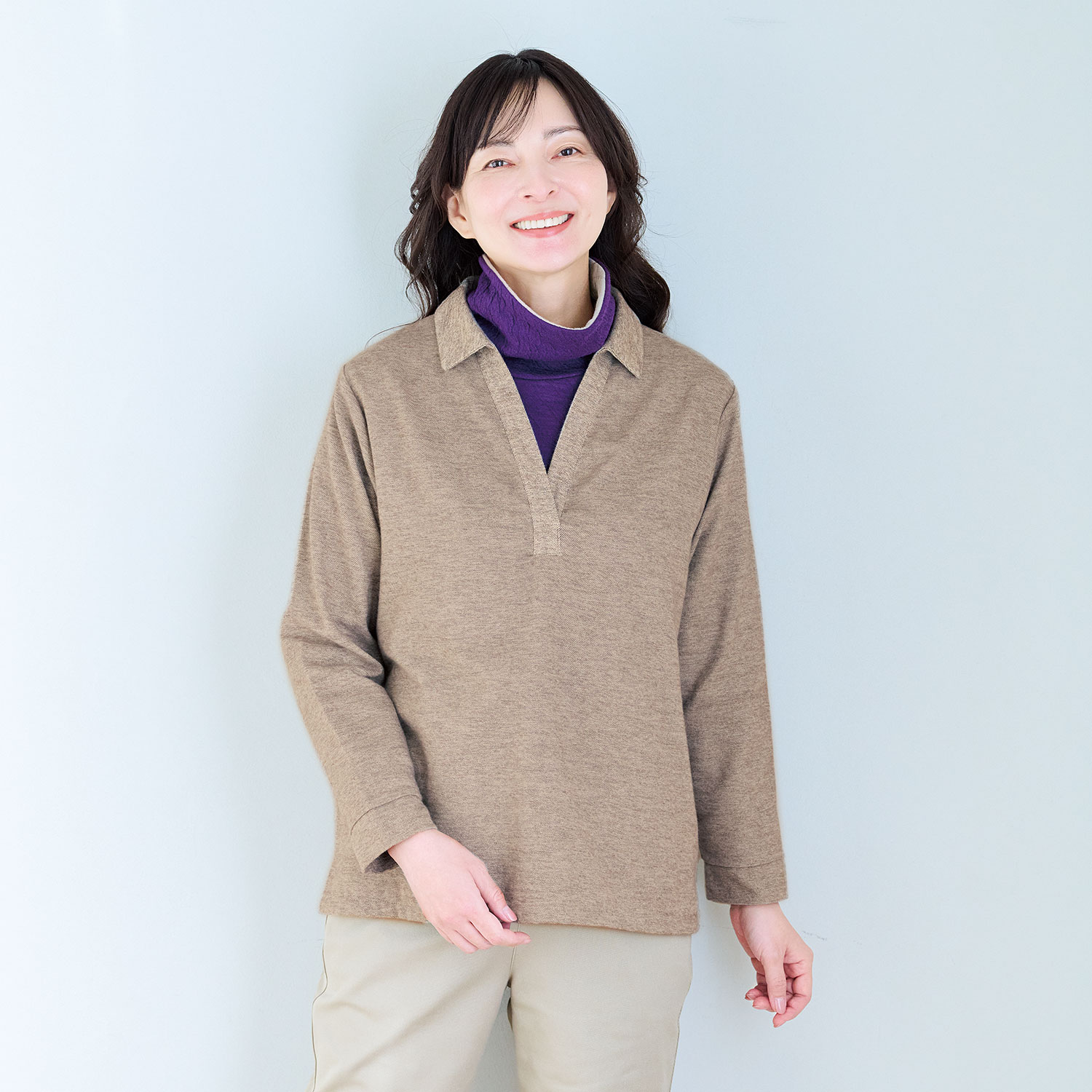 深めに開いたスキッパー衿で顔回りがすっきり見え、長めの丈と両裾のスリットで腰回りもゆったり。