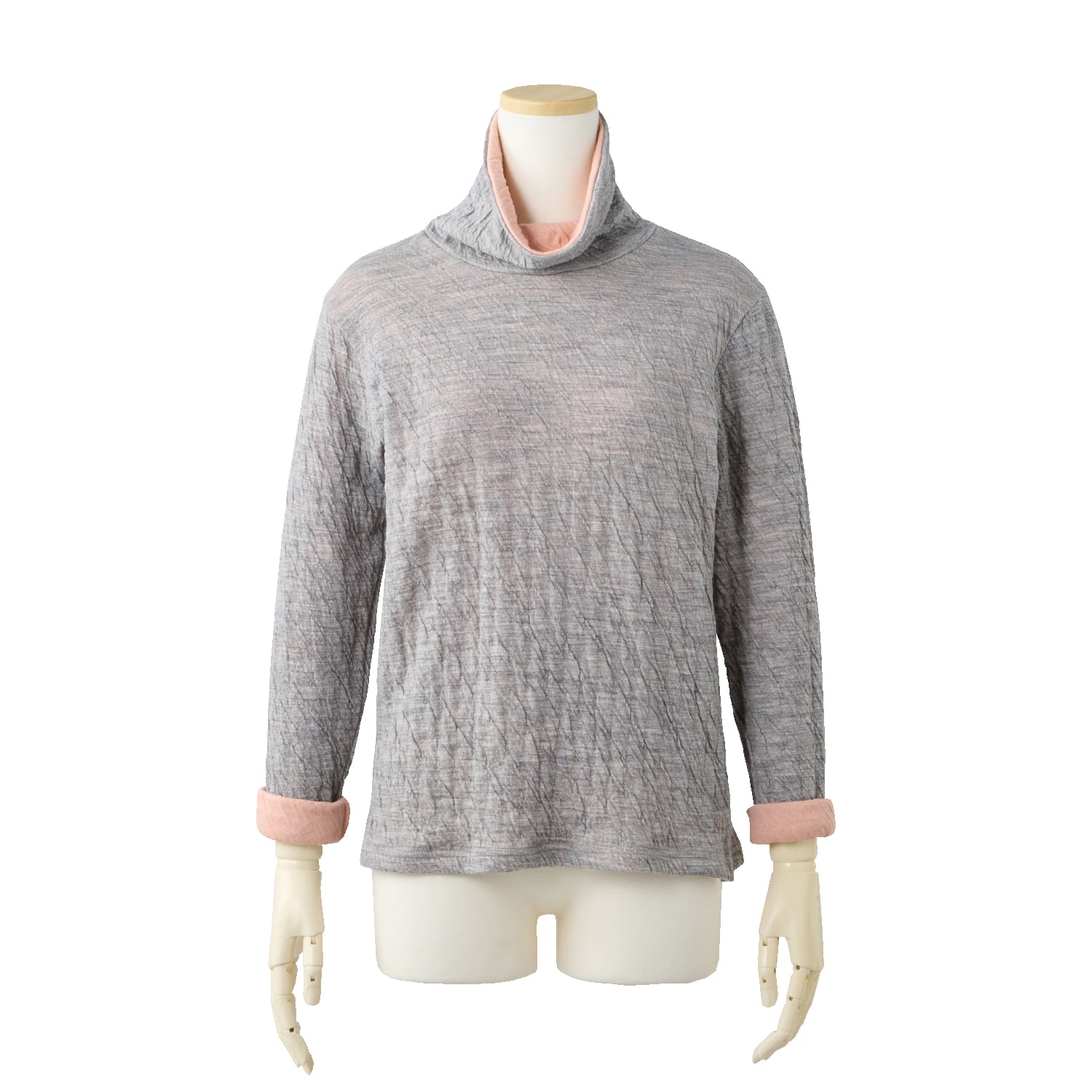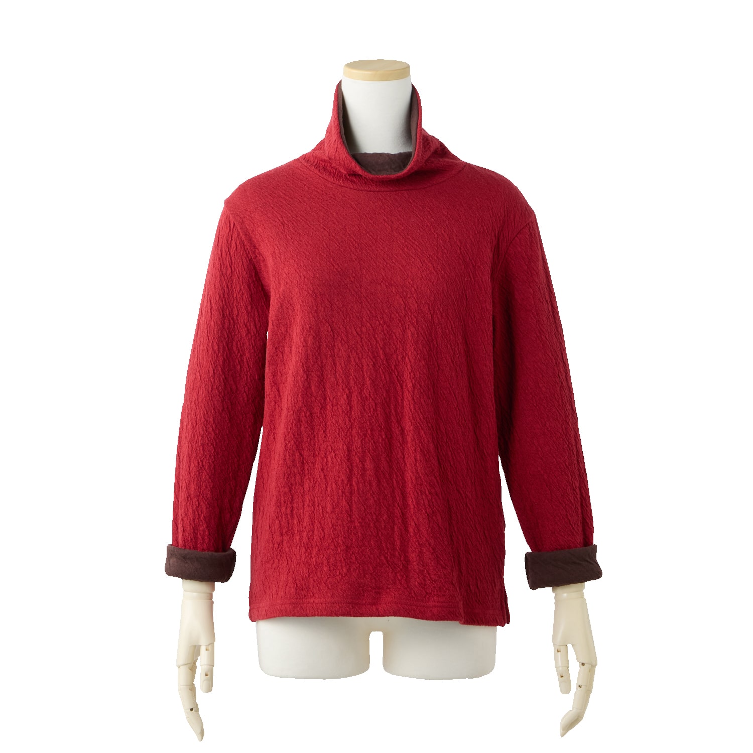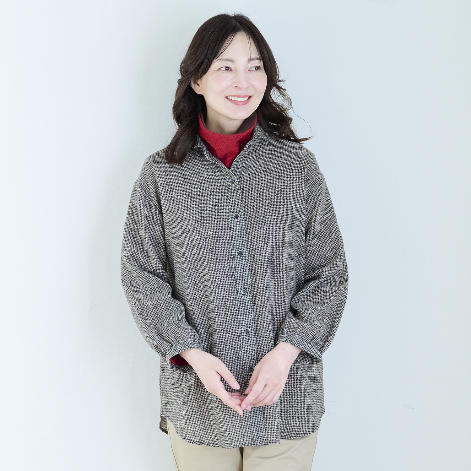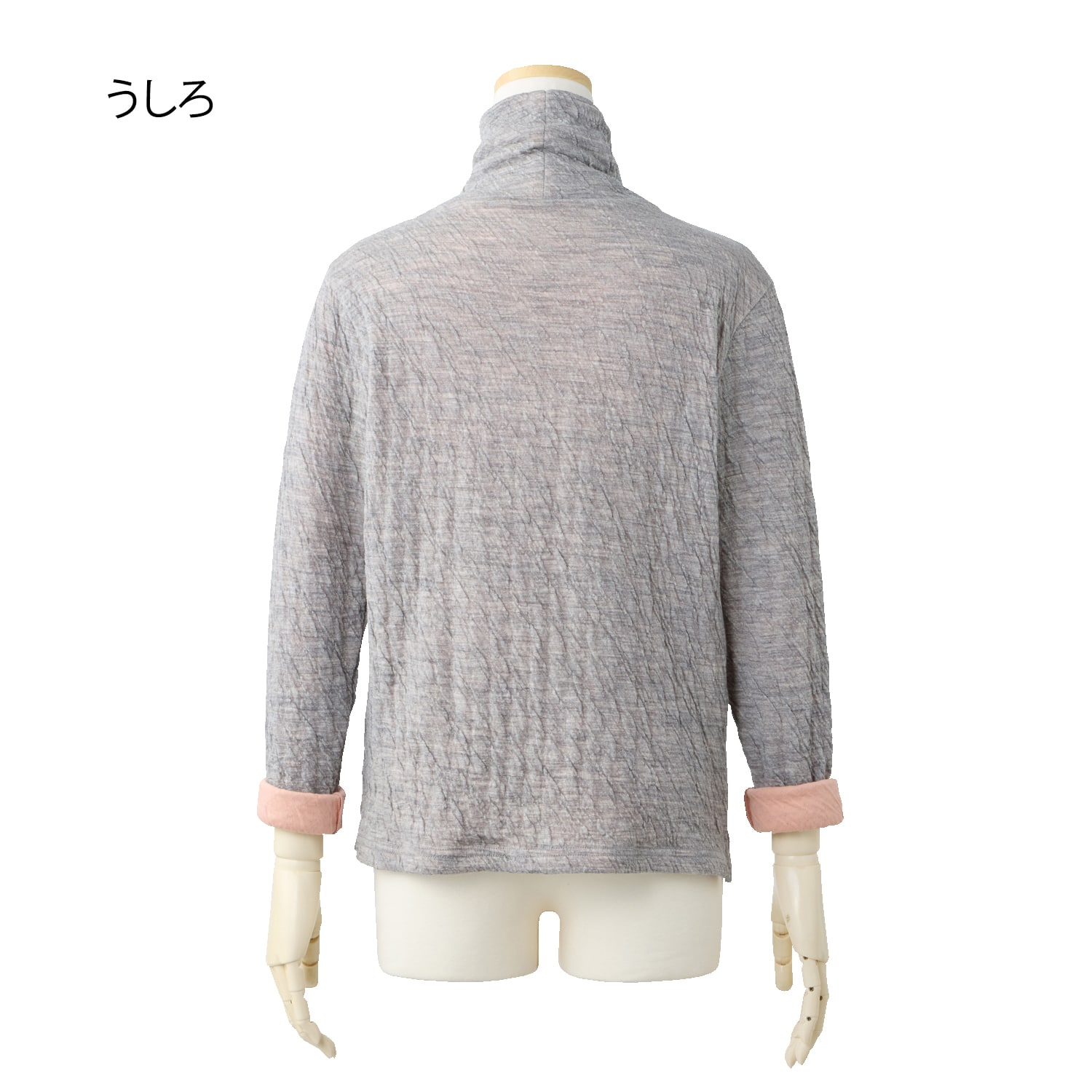 保温性のあるウールと、優しい肌触りのコットンを重ね合わせた接結素材。二枚仕立てなので空気を含んで暖かく、肌側はコットンなので首回りもチクチクしません。ウールのポコポコとした質感が生み出す豊かな表情と、深みのある杢(もく)調のカラーが魅力。衿もとや袖口からのぞく配色もポイント。ご家庭で洗濯でき、お手入れも簡単です!