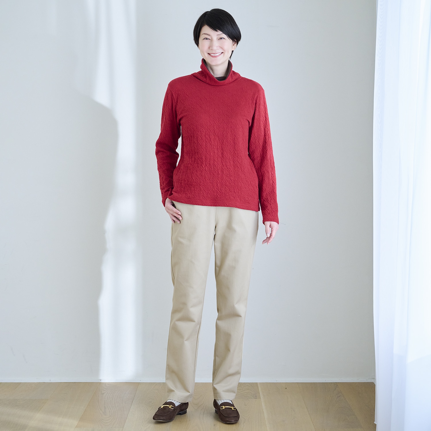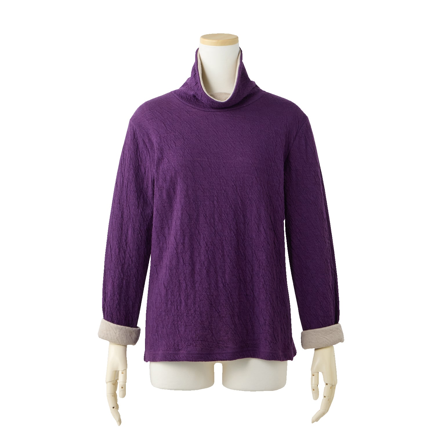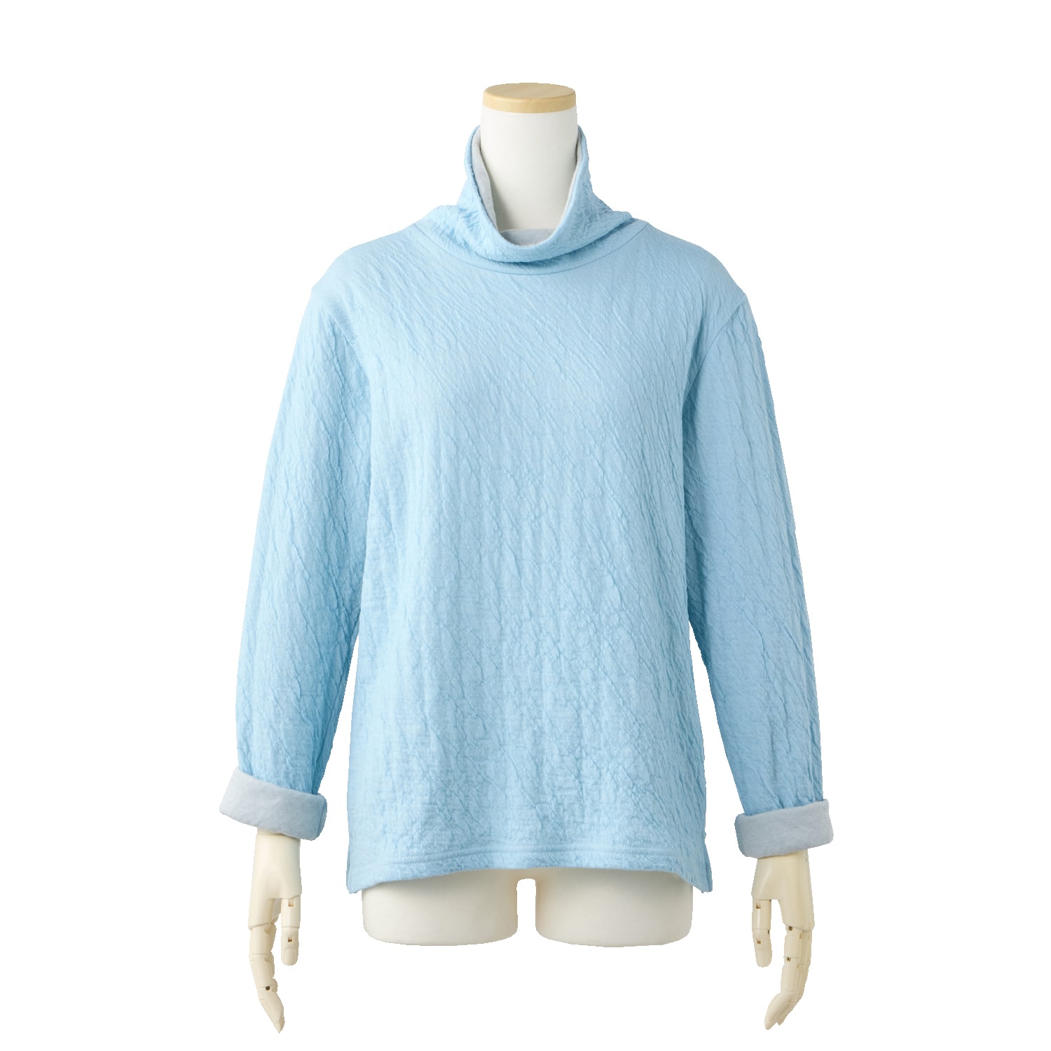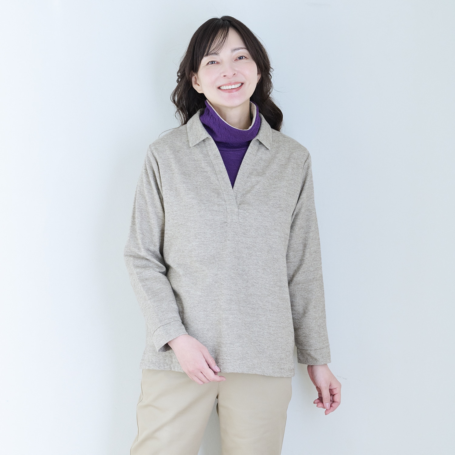 保温性のあるウールと、優しい肌触りのコットンを重ね合わせた接結素材。二枚仕立てなので空気を含んで暖かく、肌側はコットンなので首回りもチクチクしません。ウールのポコポコとした質感が生み出す豊かな表情と、深みのある杢(もく)調のカラーが魅力。衿もとや袖口からのぞく配色もポイント。ご家庭で洗濯でき、お手入れも簡単です!