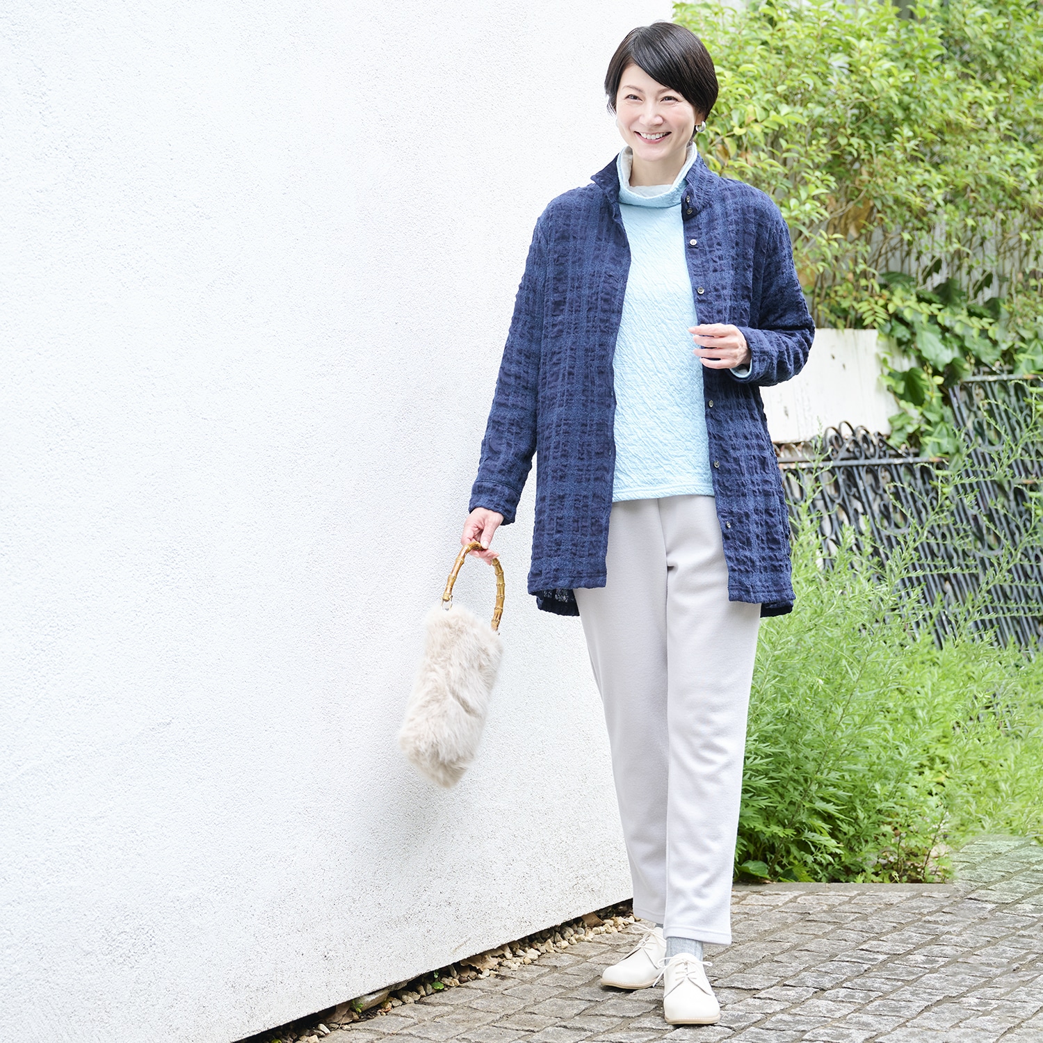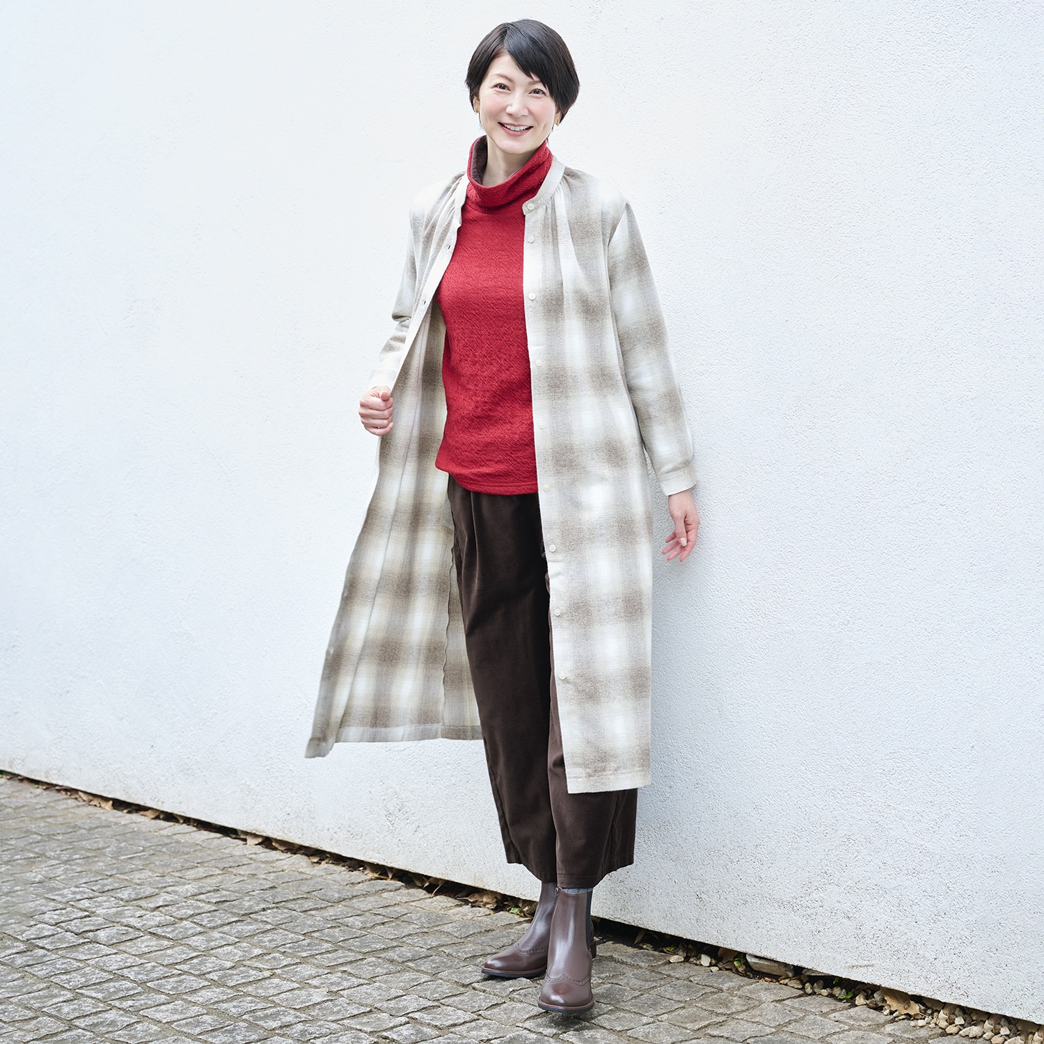 衿もとや袖口からのぞく配色もポイント。