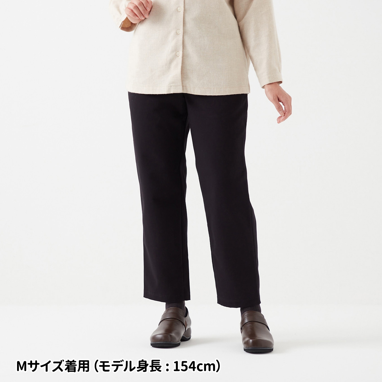 肉厚の生地が脚のラインをカバーし、体型をきれいに見せるストレートシルエット。