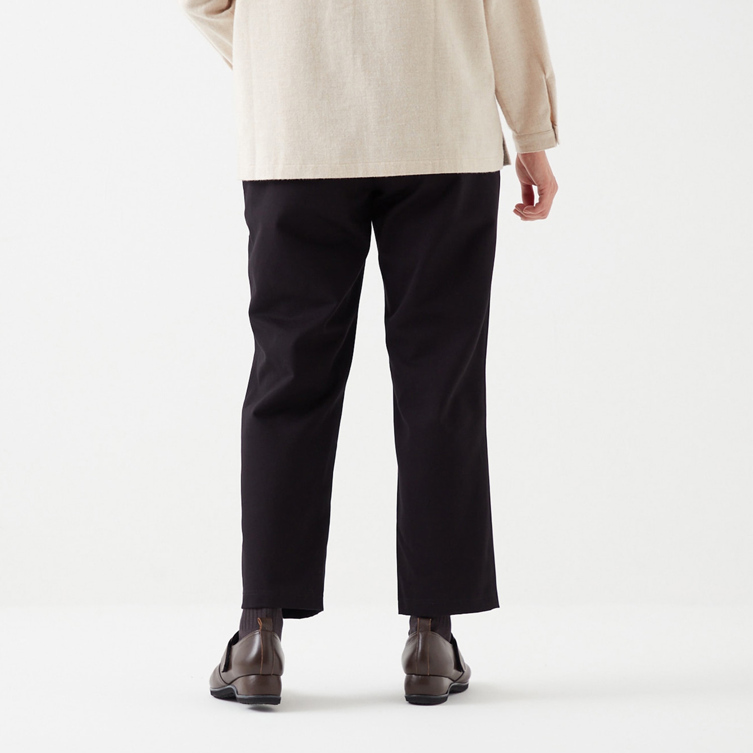厚手のツイル生地に起毛加工を施した高級感のある質感に仕上げました。暖かな風合いで、はいた瞬間から温もりに包まれます。肉厚の生地が脚のラインをカバーし、体型をきれいに見せるストレートシルエット。ウエストの後ろはゴム仕様ではき心地も楽らく。股下60㎝丈も加わり、3レングスからぴったりのサイズをお選びいただけます。