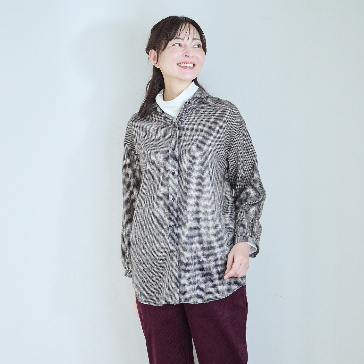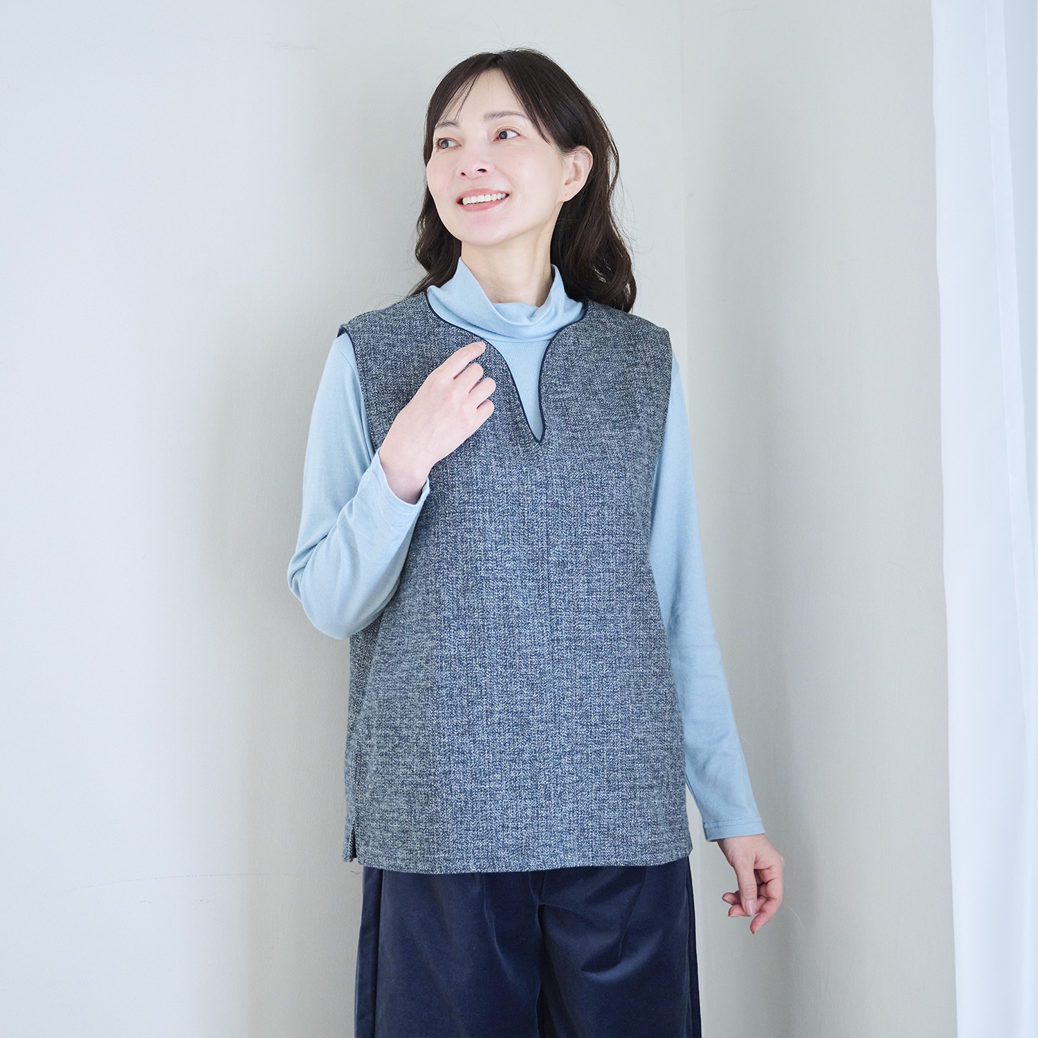 シンプルなタートルネックでインナーとして合わせやすく、幅広く着回せます。