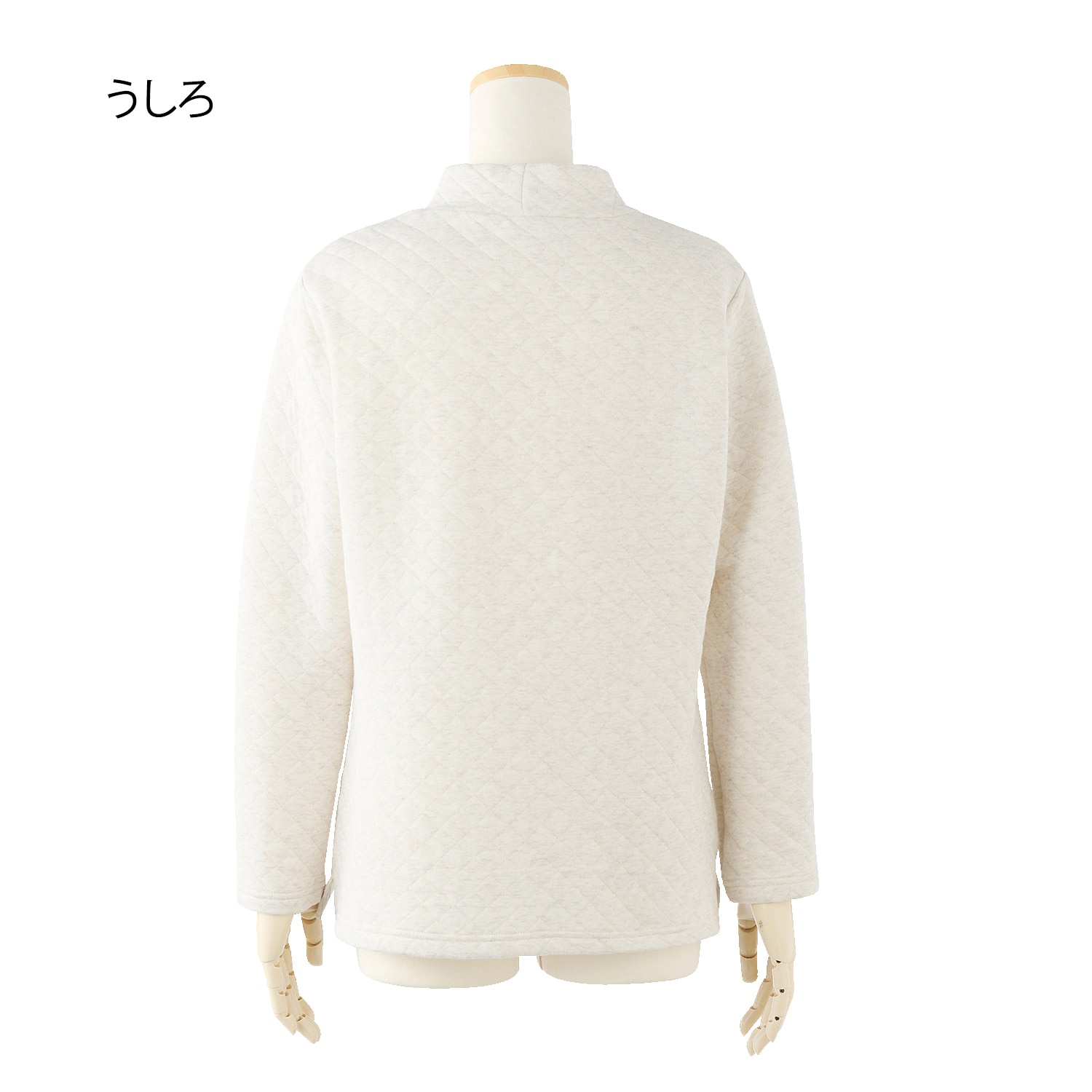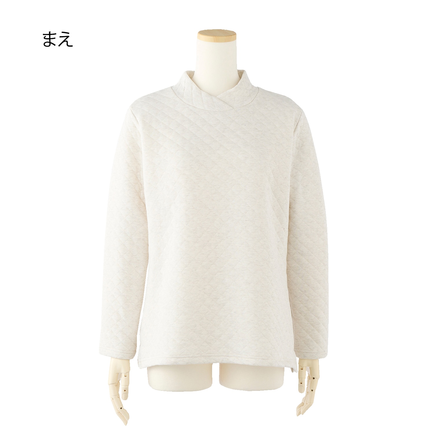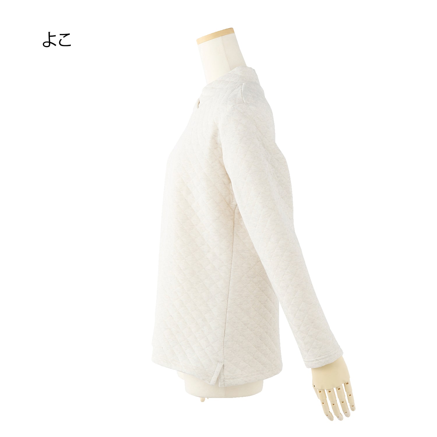 コットン生地の間に中綿を挟んだキルト素材のプルオーバー。肌触りが良く、中綿(なかわた)が体温を逃がさないので温もりが続きます。深みのある杢(もく)調の色味も魅力です。ハイネックの首もとは重ね衿仕様で、首回りを上品にカバー。ふっくらした生地で体のラインを拾いにくいのも嬉しいポイントです。