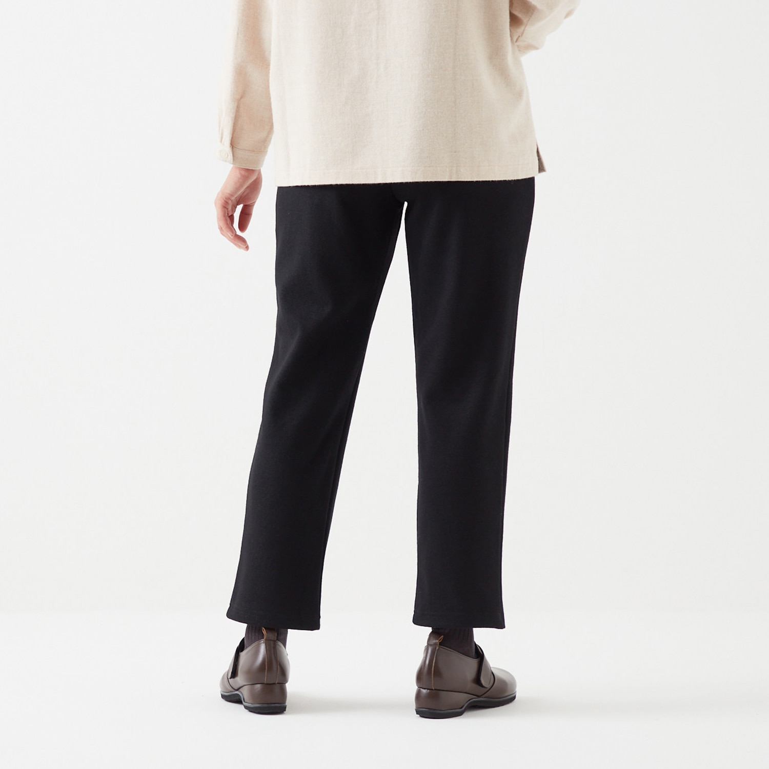 毛織物の産地・尾州で作られた上質な圧縮ウールを使用しました。肉厚でしっかり暖か、チクチクしないなめらかな肌触り。リラックス感のある着心地です。太ももはゆったりさせつつ、裾へと細くなるすっきりとしたシルエット。ウエストはゴムと内紐付きで自在にサイズ調整できます。