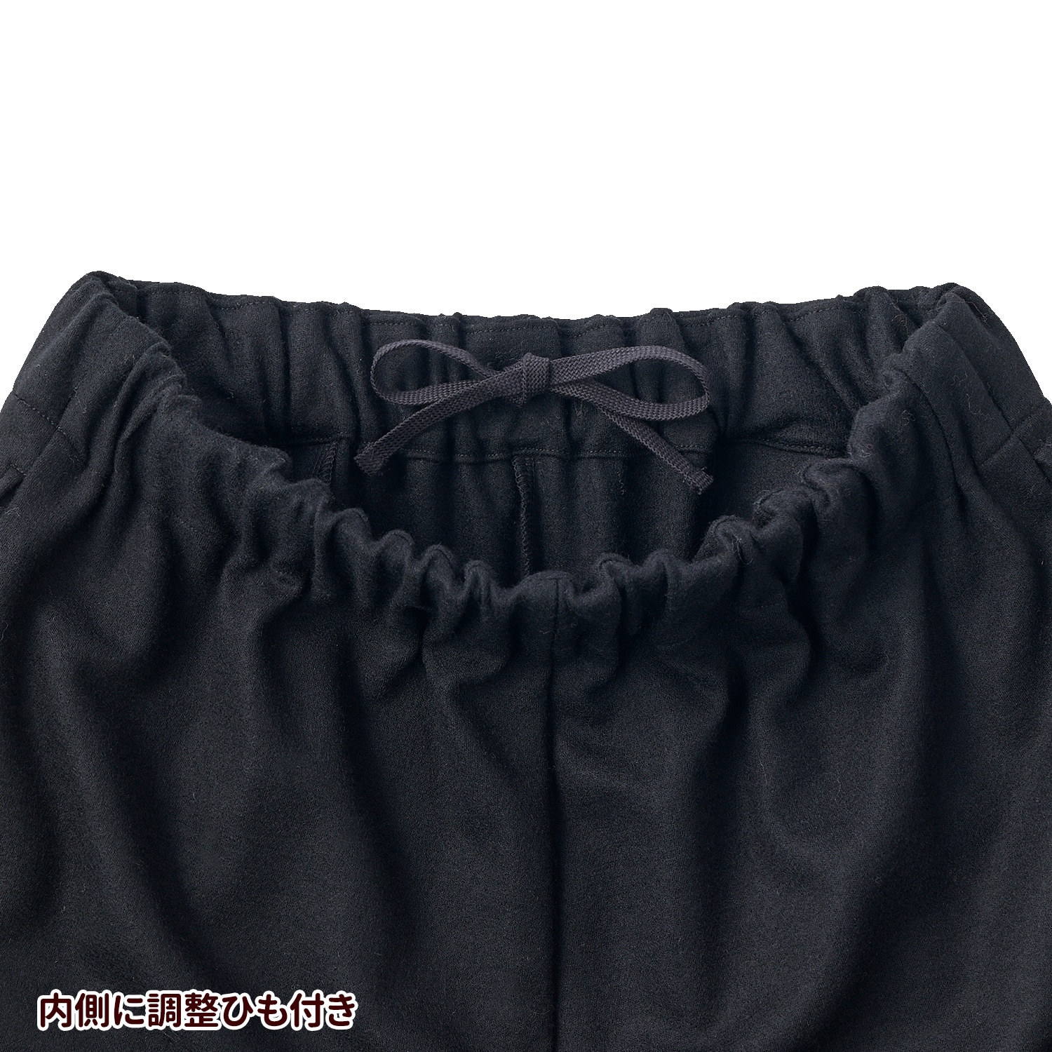 ウエストはゴムと内紐付きで自在にサイズ調整できます。