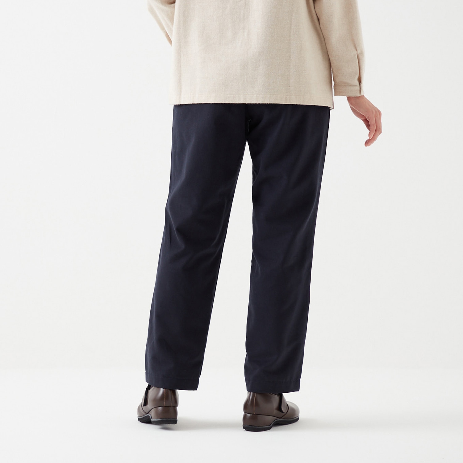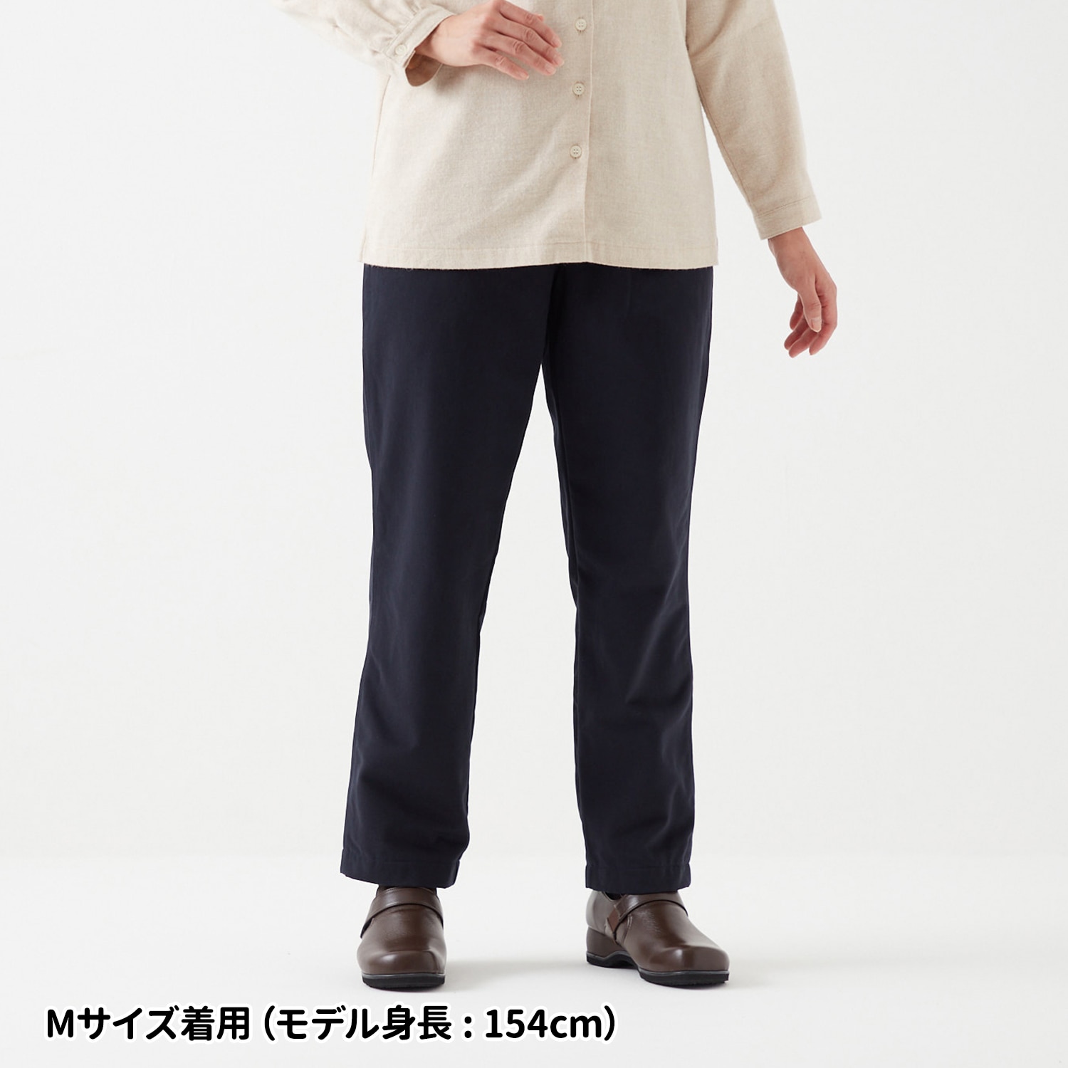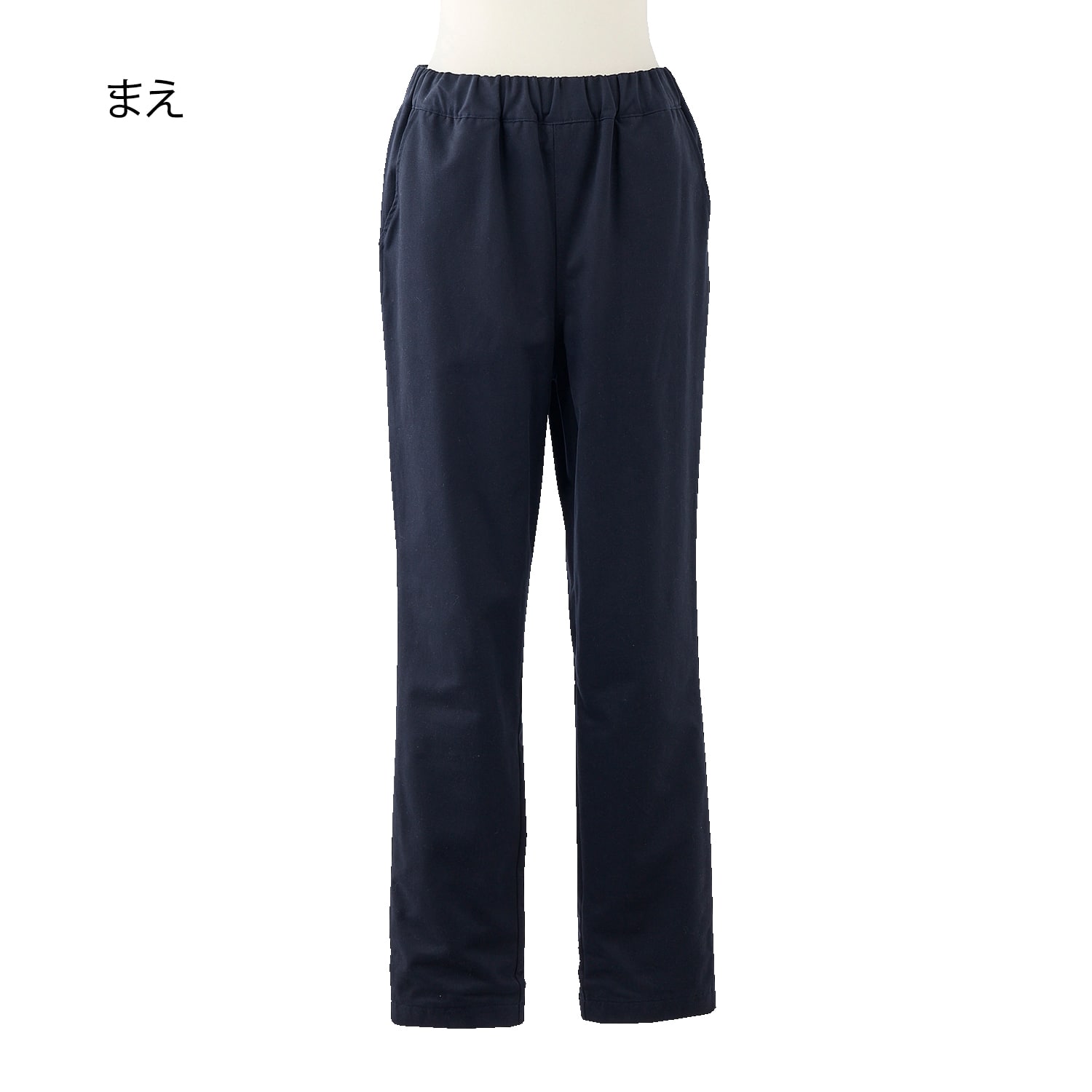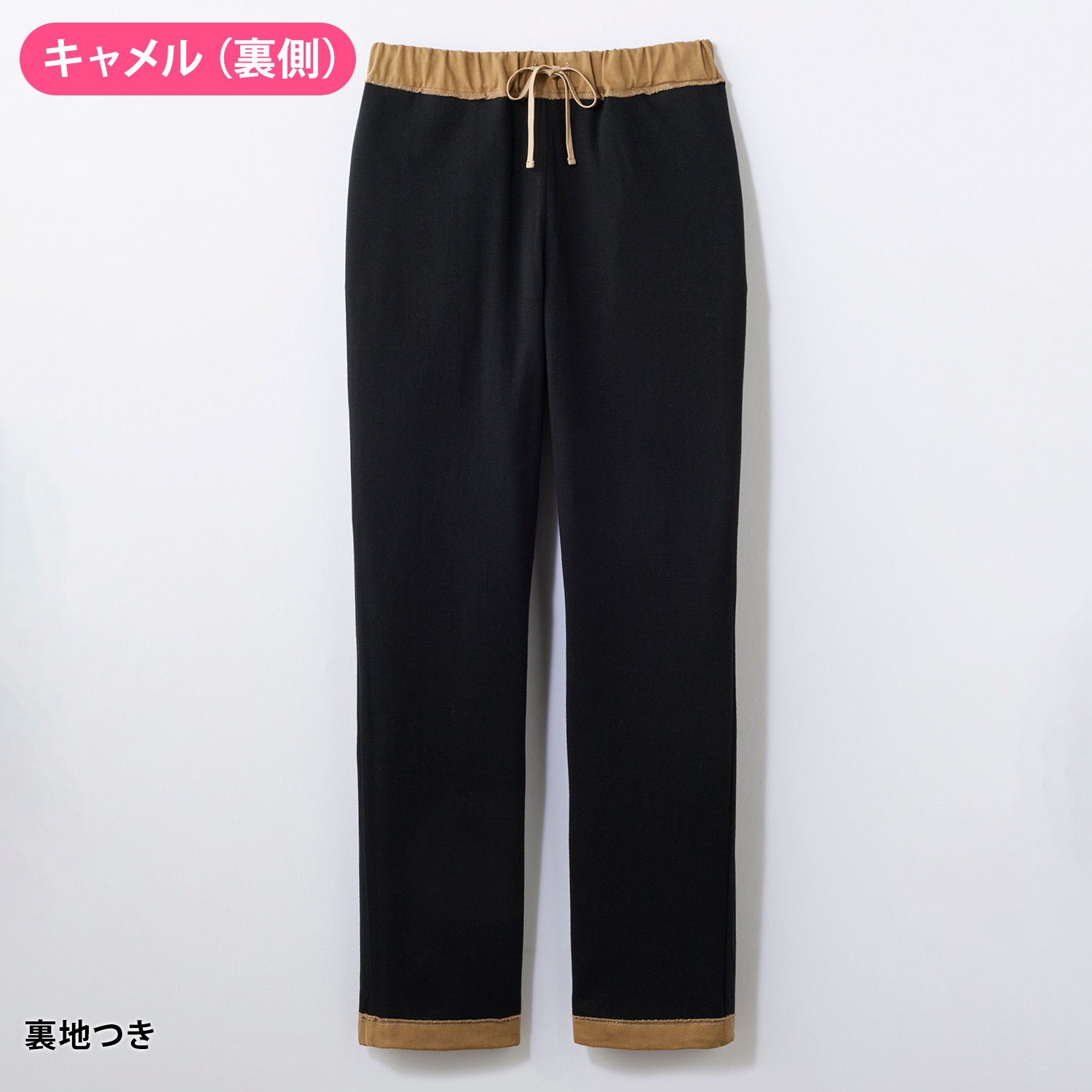 すっきり見えるのに、実は裏地付きの優秀な一本。裏地は綿100%の接結カットソーなので、実質3層構造の暖かさです。シンプルなストレートシルエットで日常使いからお出かけまで活躍。ウエストはゴム仕様と内紐付きで、サイズ調節も簡単です。