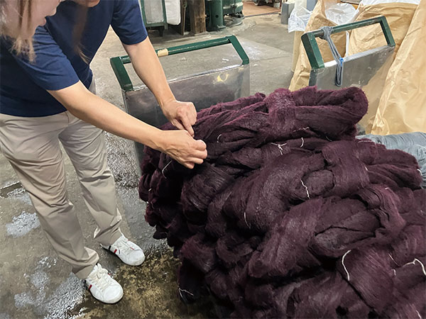 ▲高温で染められた直後の糸の束