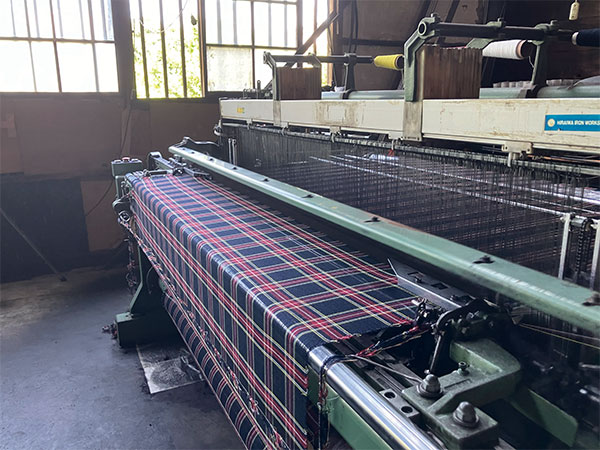 次に案内していただいたのは、織機が4~5台ほど並んだ木造の小さな織物工場。大きな音を立てながら少しずつ生地が織られていく様子を、工場を営む中島ご夫妻が見せてくださいました。