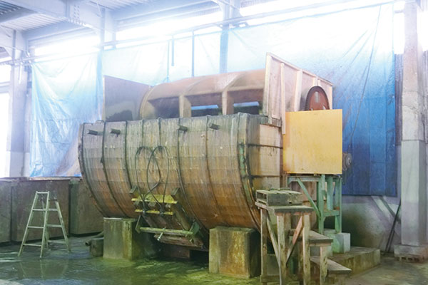 ▲木製の装置で皮を数時間鞣す。