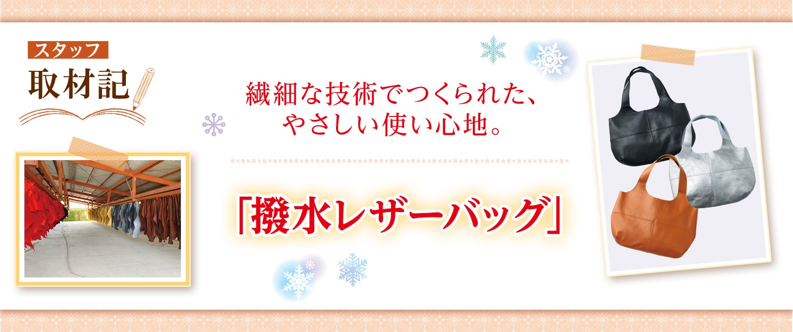 吹く風が冷たく感じる季節になりました。いかがお過ごしでしょうか。冬の寒さでこわばった身体を天然素材のぬくもりで、優しくほぐせたら。ここでは、そんな思いを込めた『着心地のいい服』冬号から、「たつのレザー」で作られる上質な牛革のバッグをご紹介します。革本来の質感や風合いを愉しめ、時間が経つ程に味わい深さが増してゆく逸品です。なぜこんなにも美しい革の表情が出せるのか――その秘密を探るため、革の産地である兵庫県・たつの市、ごとう製革所を訪ねました。